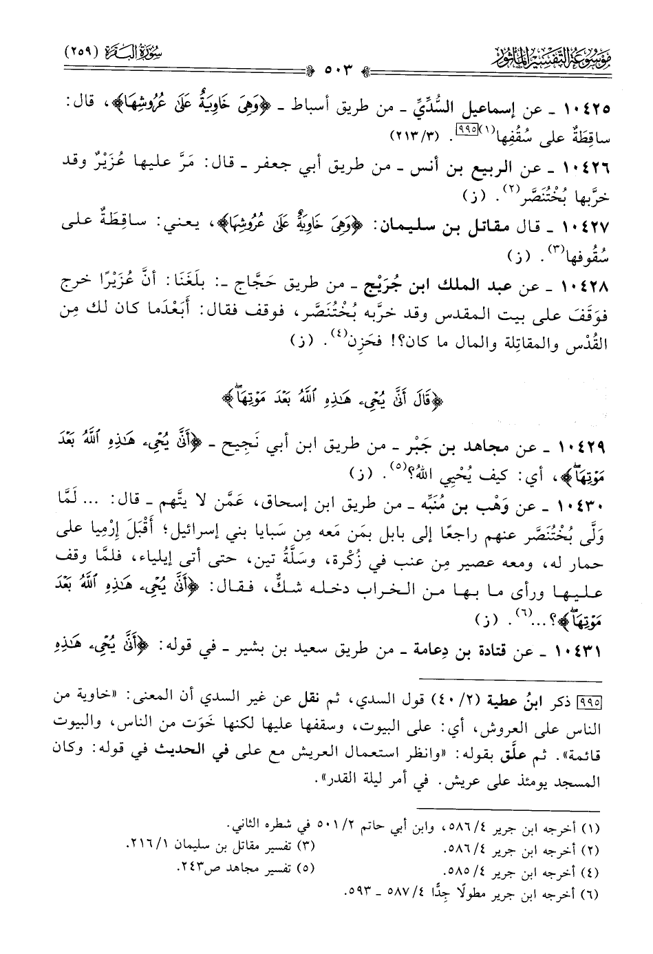١٠٤٢٦ - عن الربيع بن أنس -من طريق أبي جعفر- قال: مَرَّ عليها عُزَيْرٌ وقد خرَّبها بُخْتُنَصَّر (¬٢). (ز)