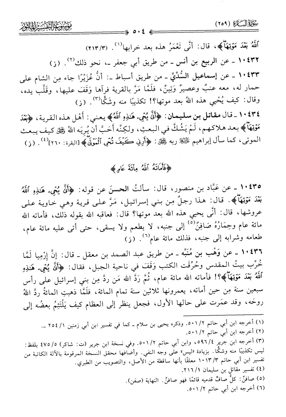 ١٠٤٣٥ - عن عَبّاد بن منصور، قال: سألتُ الحسنَ عن قوله: {أنى يحيي هذه الله بعد موتها}. قال: هذا رجلٌ مِن بني إسرائيل، مَرَّ على قرية وهي خاوية على عروشها، قال: أنّى يحيي هذه الله بعد موتها؟ قال: فعاقبه الله بقوله ذلك، فأماته الله مائة عام وحِمارُهُ صافِنٌ (¬٥) إلى جنبه، لا يطعم ولا يسقى، حتى أتى عليه مائة عام، طعامه وشرابه إلى جنبه، فذلك مائة عام (¬٦). (ز)