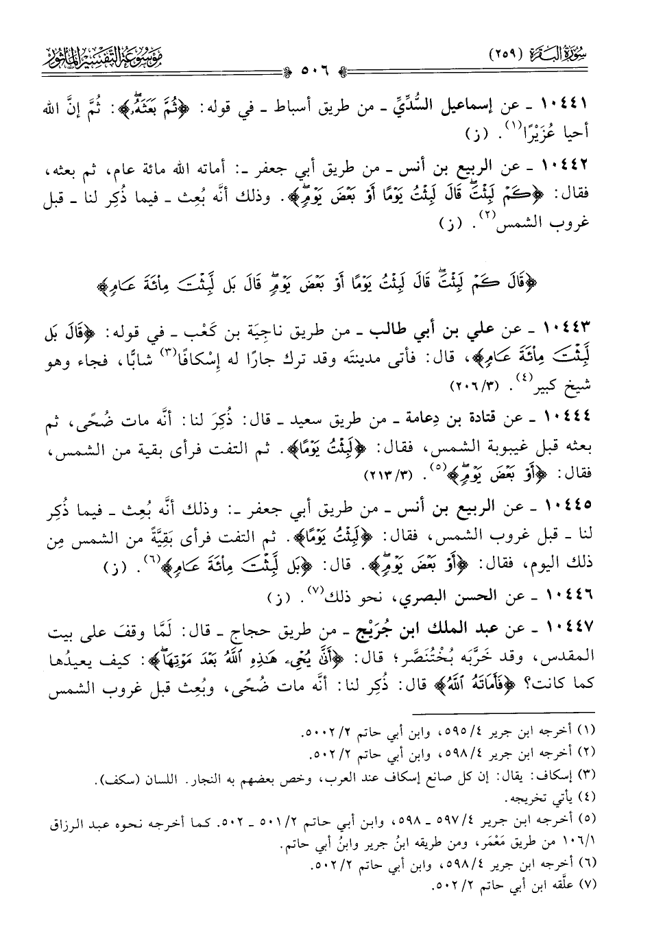 ١٠٤٤٤ - عن قتادة بن دِعامة -من طريق سعيد- قال: ذُكِرَ لنا: أنّه مات ضُحًى، ثم بعثه قبل غيبوبة الشمس، فقال: {لبثت يومًا}. ثم التفت فرأى بقية من الشمس، فقال: {أو بعض يوم} (¬٥). (٣/ ٢١٣)