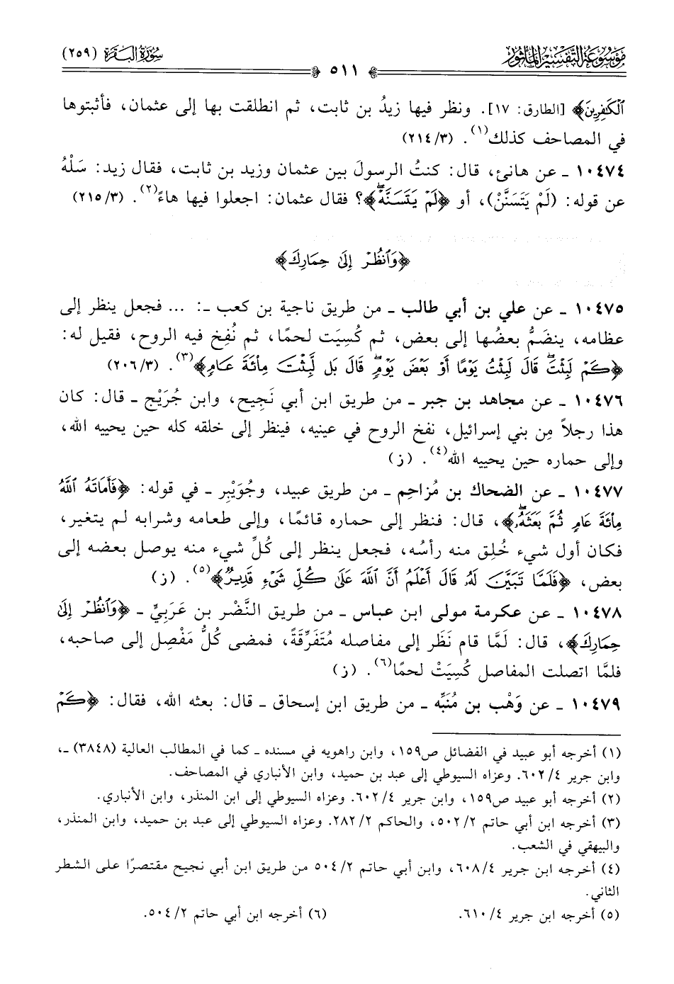 ١٠٤٧٥ - عن علي بن أبي طالب -من طريق ناجية بن كعب-: ... فجعل ينظر إلى عظامه، ينضَمُّ بعضُها إلى بعض، ثم كُسِيَت لحمًا، ثم نُفِخ فيه الروح، فقيل له: {كم لبثت قال لبثت يوما أو بعض يوم قال بل لبثت مائة عام} (¬٣). (٣/ ٢٠٦)