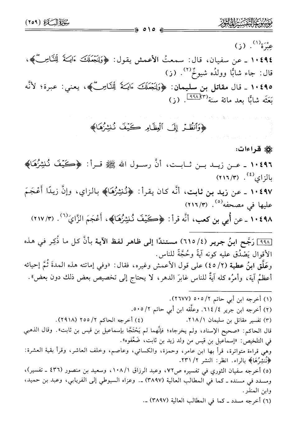 ١٠٤٩٧ - عن زيد بن ثابت، أنّه كان يقرأ: {نُنشِزُها} بالزاي، وإنّ زيدًا أعْجَمَ عليها في مصحفه (¬٥). (٣/ ٢١٦)