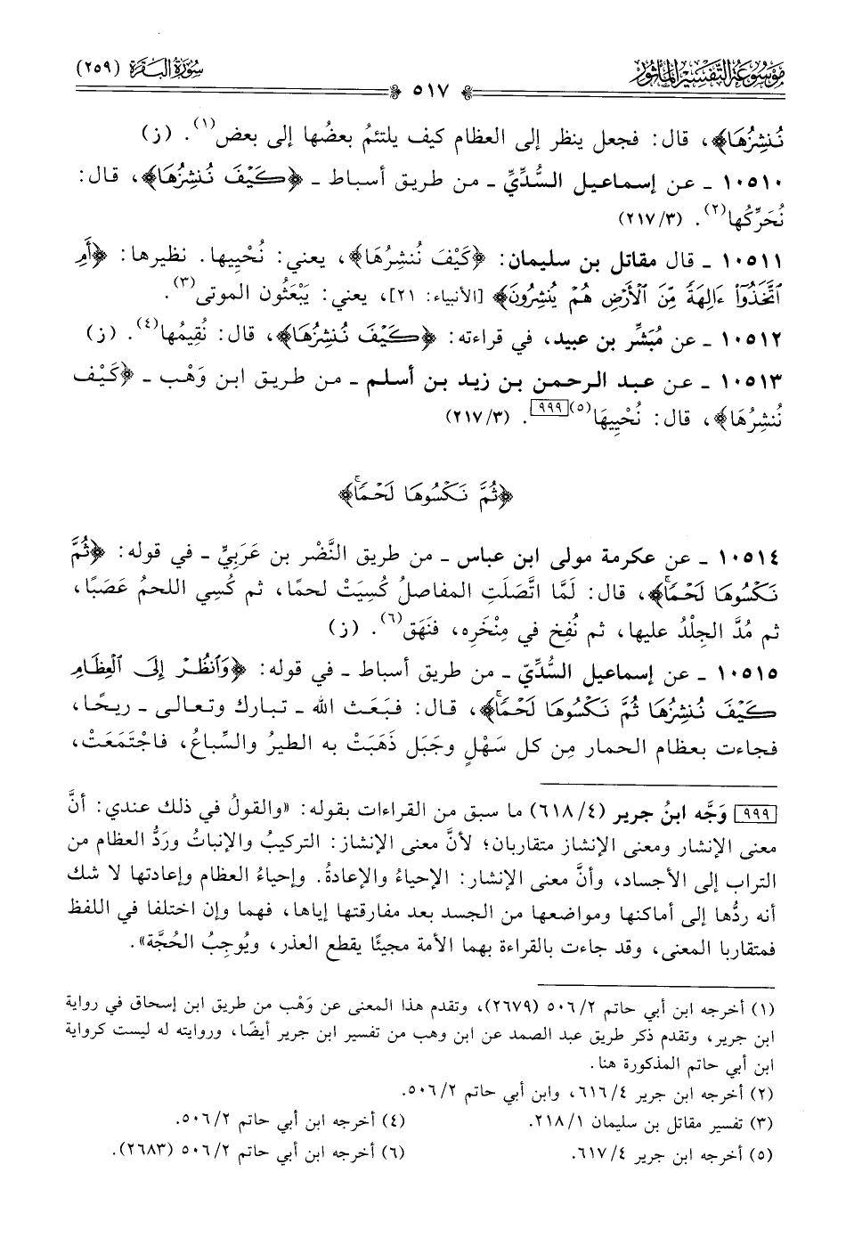 ١٠٥١٥ - عن إسماعيل السُّدِّيّ -من طريق أسباط- في قوله: {وانْظُرْ إلى العِظامِ كَيْفَ نُنْشِزُها ثُمَّ نَكْسُوها لَحْمًا}، قال: فبَعَث الله -تبارك وتعالى- ريحًا، فجاءت بعظام الحمار مِن كل سَهْلٍ وجَبَل ذَهَبَتْ به الطيرُ والسِّباعُ، فاجْتَمَعَتْ،