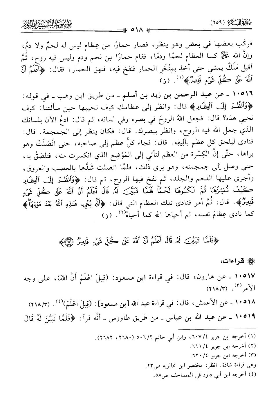 ١٠٥١٦ - عن عبد الرحمن بن زيد بن أسلم -من طريق ابن وهب- في قوله: {وانظر إلى العظام} قال: وانظر إلى عظامك كيف نحييها حين سألتنا: كيف نحيي هذه؟ قال: فجعل اللهُ الروحَ في بصره وفي لسانه، ثم قال: ادعُ الآن بلسانك الذي جعل الله فيه الروح، وانظر ببصرك. قال: فكان ينظر إلى الجمجمة. قال: فنادى ليلحق كل عظم بألِيفِه. قال: فجاء كلُّ عظم إلى صاحبه، حتى اتَّصَلَتْ وهو يراها، حتّى إنّ الكِسْرة من العظم لتأتي إلى المَوْضِع الذي انكسرت منه، فتلصَقُ به، حتى وصل إلى جمجمته، وهو يرى ذلك، فلمّا اتصلت شَدَّها بالعصب والعروق، وأجرى عليها اللحم والجلد، ثم نفخ فيها الروح، ثم قال: {انظر إلى العظام كيف ننشرها ثم نكسوها لحمًا فلما تبين له قال أعلم أن الله على شيء قدير}. قال: ثُمَّ أمر فنادى تلك العظام التي قال: {أنّى يُحيي هذه الله بعد موتها} كما نادى عِظامَ نفسه، ثم أحياها الله كما أحياهُ (¬٢). (ز)