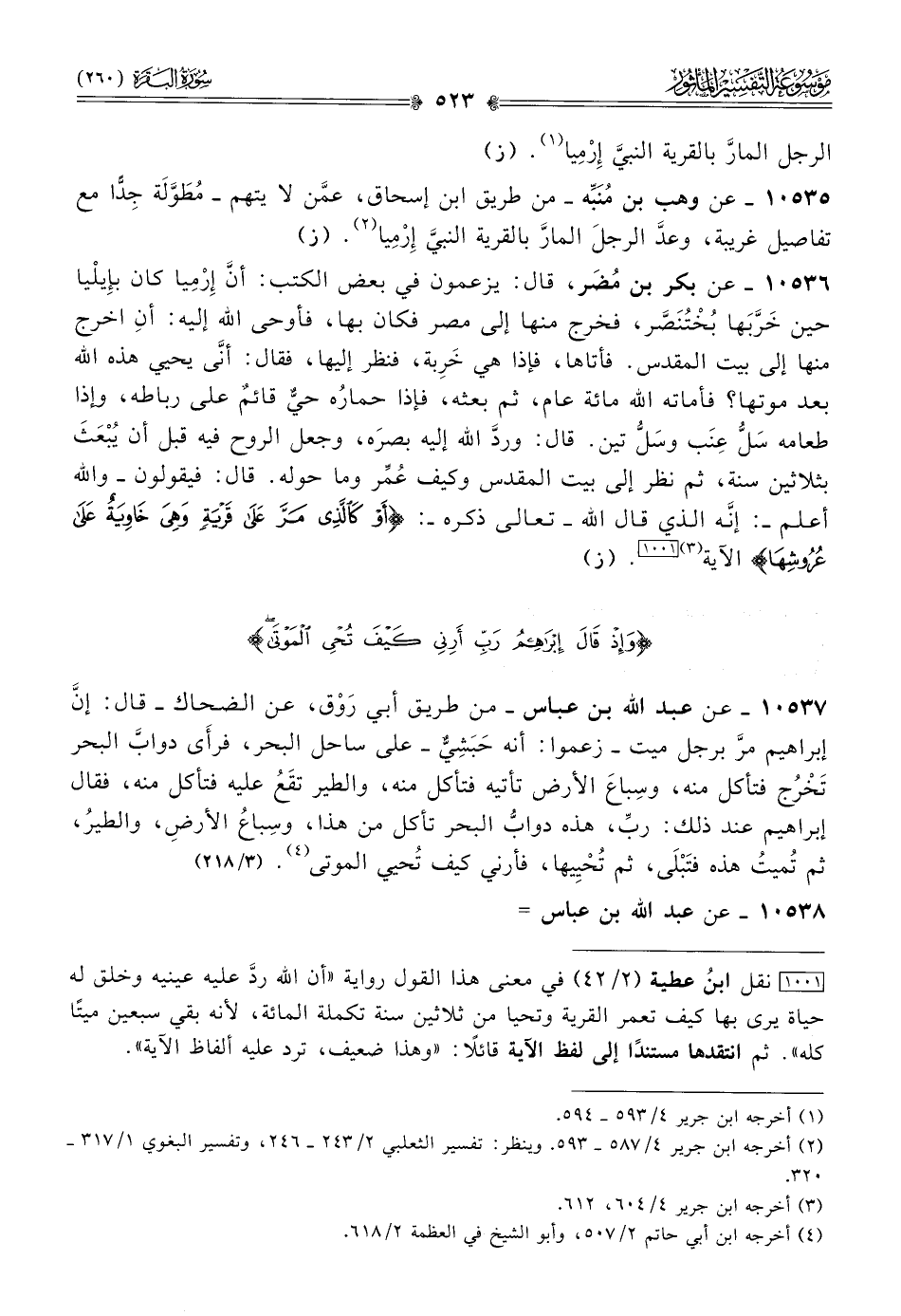 ١٠٥٣٥ - عن وهب بن مُنَبِّه -من طريق ابن إسحاق، عمَّن لا يتهم- مُطَوَّلَة جِدًّا مع تفاصيلمخمخمخمخ غريبة، وعدَّ الرجلَ المارَّ بالقرية النبيَّ إرْمِيا (¬٢). (ز)