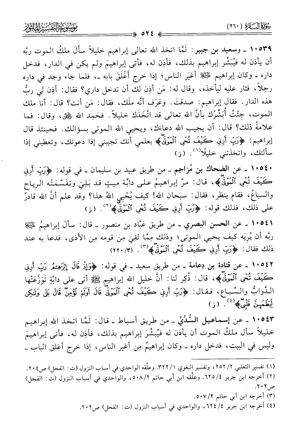 ١٠٥٣٩ - وسعيد بن جبير: لَمّا اتخذ الله تعالى إبراهيم خليلًا سأَلَ ملكُ الموت ربَّه أن يأذن له فيُبَشِّر إبراهيم بذلك، فأذِن له، فأتى إبراهيمَ ولم يكن في الدار، فدخل داره -وكان إبراهيم - عليه السلام - أغيَر الناس؛ إذا خرج أغْلَقَ بابه-، فلما جاء وجد في داره رجلًا، فثار عليه ليأخذه، وقال له: مَن أذِن لك أن تدخل داري؟ فقال: أذِن لي ربُّ هذه الدار. فقال إبراهيم: صدقتَ. وعَرَف أنّه ملَك، فقال: مَن أنت؟ قال: أنا ملك الموت، جِئْتُ أُبَشِّرُك بأنّ الله تعالى قد اتَّخَذَك خليلًا. فحَمِد الله - عز وجل -، وقال: فما علامةُ ذلك؟ قال: أن يجيب الله دعاءَك، ويحيي الله الموتى بسؤالك. فحينئذ قال إبراهيم: {رَبِّ أرِنِي كَيْفَ تُحْيِ المَوْتى} بعلمي أنك تجيبني إذا دعوتك، وتعطيني إذا سألتك، واتخذتني خليلًا (¬١). (ز)