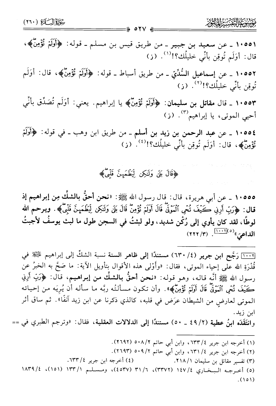 [١٠٠٢] رَجَّح ابن جرير (٤/ ٦٣٠) مستندًا إلى ظاهر السنة نسبة الشكِّ إلى إبراهيم - عليه السلام - في قُدْرَةِ الله على إحياء الموتى، فقال: «وأَوْلى هذه الأقوال بتأويل الآية: ما صَحَّ به الخبرُ عن رسول الله - صلى الله عليه وسلم - أنّه قاله، وهو قوله: «نحن أحقُّ بالشكِّ من إبراهيم، قال: {رَبِّ أرِنِي كَيْفَ تُحْيِ المَوْتى قالَ أوَلَمْ تُؤْمِن}». وأن تكون مسألتُه ربَّه ما سأله أن يُرِيَه من إحيائه الموتى لعارضٍ من الشيطان عرَض في قلبه، كالذي ذكرنا عن ابن زيد آنفًا». ثم ساق أثر ابن زيد.