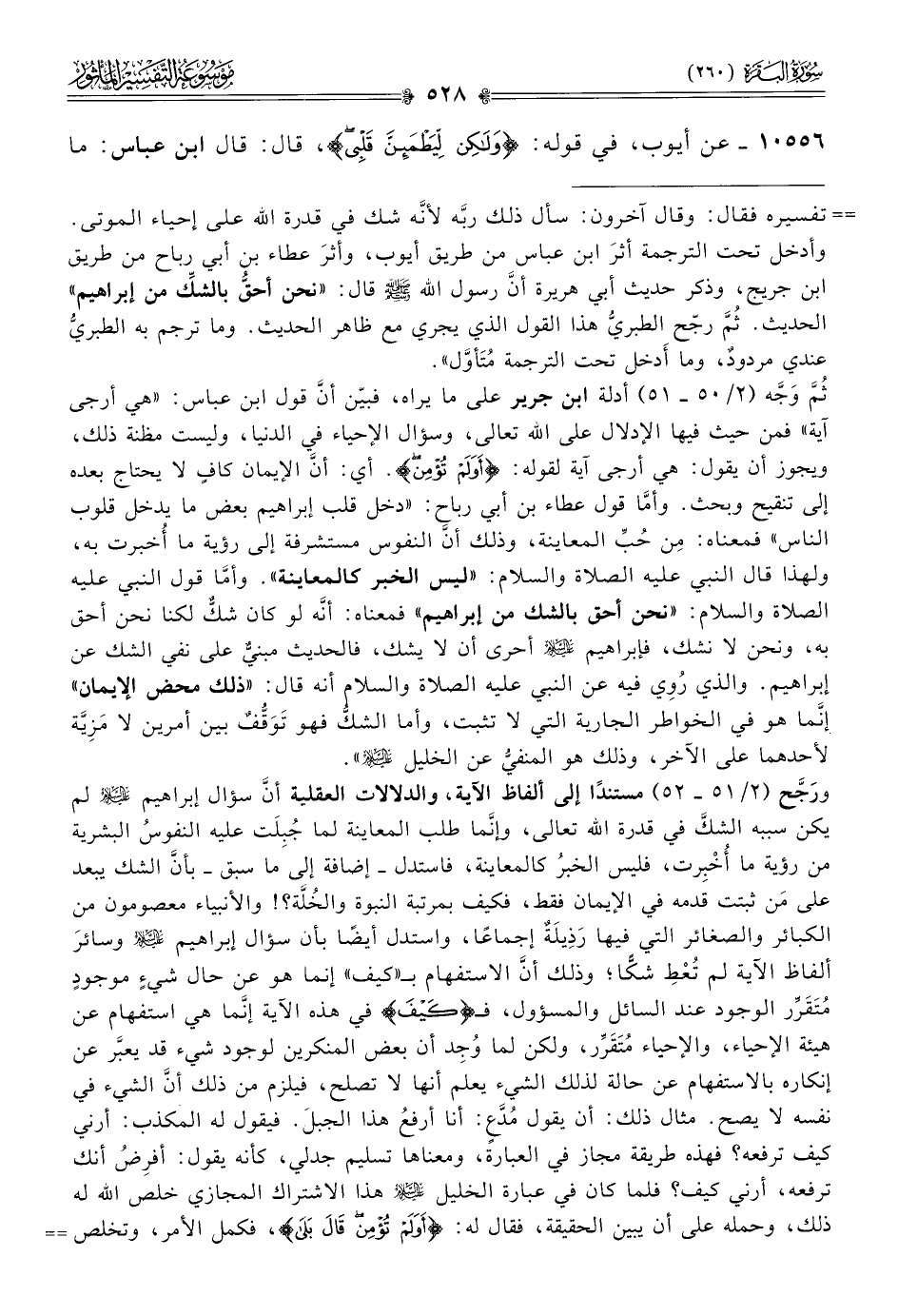 = تفسيره فقال: وقال آخرون: سأل ذلك ربَّه لأنّه شك في قدرة الله على إحياء الموتى. وأدخل تحت الترجمة أثرَ ابن عباس من طريق أيوب، وأثرَ عطاء بن أبي رباح من طريق ابن جريج، وذكر حديث أبي هريرة أنّ رسول الله - صلى الله عليه وسلم - قال: «نحن أحقُّ بالشكِّ من إبراهيم» الحديث. ثُمَّ رجّح الطبريُّ هذا القول الذي يجري مع ظاهر الحديث. وما ترجم به الطبريُّ عندي مردودٌ، وما أدخل تحت الترجمة مُتَأوَّل».