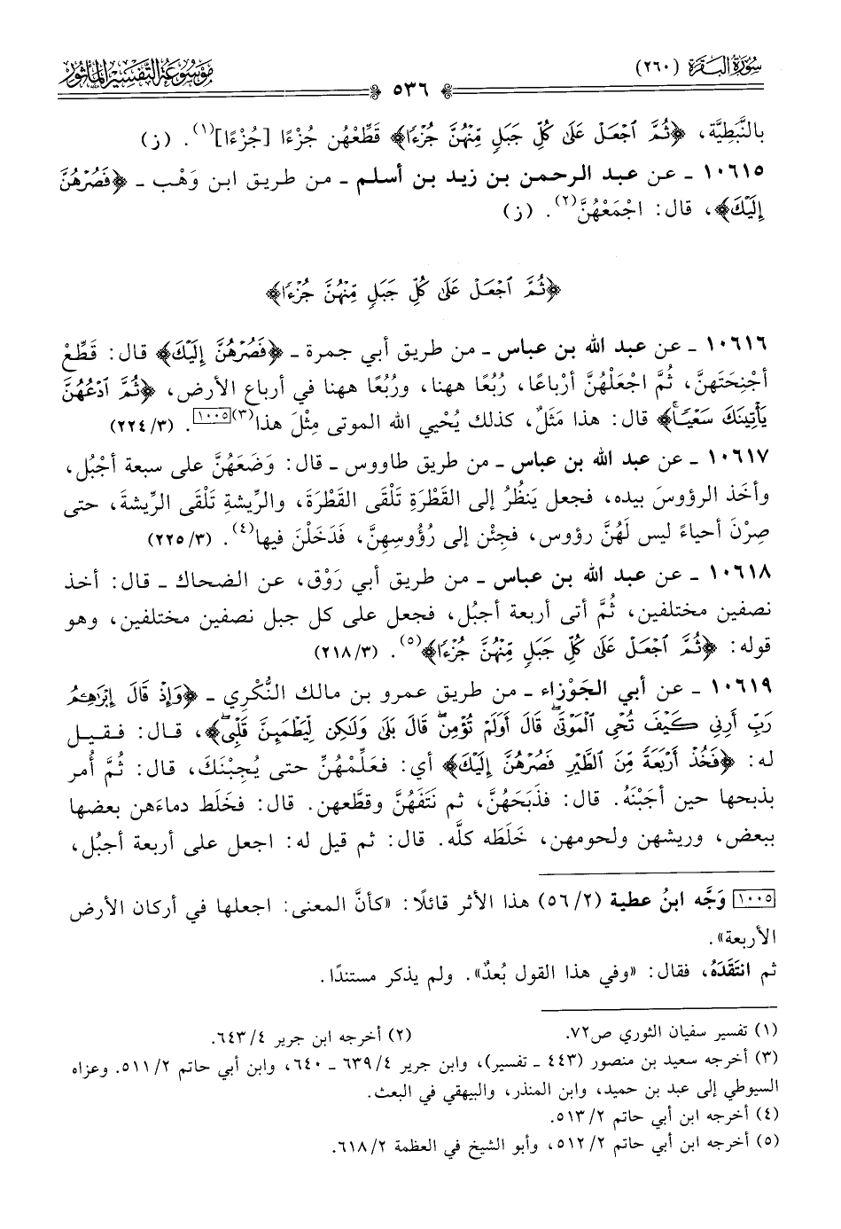 ١٠٦١٧ - عن عبد الله بن عباس -من طريق طاووس- قال: وضَعَهُنَّ على سبعة أجْبُل، وأخَذ الرؤوسَ بيده، فجعل يَنظُرُ إلى القَطْرَةِ تَلْقى القَطْرَةَ، والرِّيشةِ تَلْقى الرِّيشةَ، حتى صِرْنَ أحياءً ليس لَهُنَّ رؤوس، فجِئْن إلى رُؤُوسِهِنَّ، فَدَخَلْنَ فيها (¬٤). (٣/ ٢٢٥)