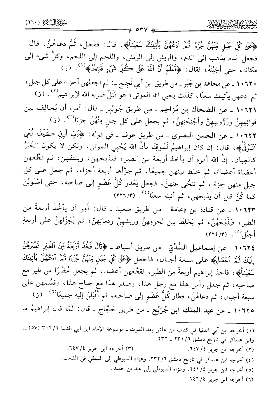 ١٠٦٢٠ - عن مجاهد بن جَبْر -من طريق ابن أبي نَجِيح-: ثم اجعلهن أجزاء على كل جبل، ثم ادعهن يأتينك سعيًا، كذلك يحيي الله الموتى؛ هو مَثَلٌ ضربه الله لإبراهيم (¬٢). (ز)
