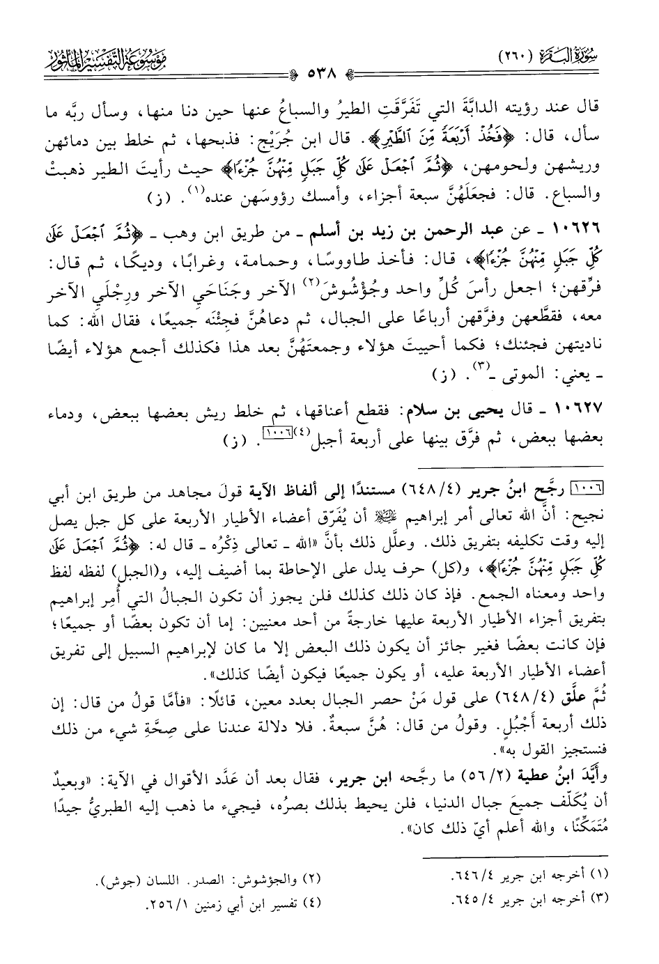 [١٠٠٦] رجَّح ابنُ جرير (٤/ ٦٤٨) مستندًا إلى ألفاظ الآية قولَ مجاهد من طريق ابن أبي نجيح: أنّ الله تعالى أمر إبراهيم - عليه السلام - أن يُفَرّق أعضاء الأطيار الأربعة على كل جبل يصل إليه وقت تكليفه بتفريق ذلك. وعلَّل ذلك بأنّ «الله -تعالى ذِكْرُه- قال له: {ثُمَّ اجْعَلْ عَلى كُلِّ جَبَلٍ مِنهُنَّ جُزْءًا}، و (كل) حرف يدل على الإحاطة بما أضيف إليه، و (الجبل) لفظه لفظ واحد ومعناه الجمع. فإذ كان ذلك كذلك فلن يجوز أن تكون الجبالُ التي أُمِر إبراهيم بتفريق أجزاء الأطيار الأربعة عليها خارجةً من أحد معنيين: إما أن تكون بعضًا أو جميعًا؛ فإن كانت بعضًا فغير جائز أن يكون ذلك البعض إلا ما كان لإبراهيم السبيل إلى تفريق أعضاء الأطيار الأربعة عليه، أو يكون جميعًا فيكون أيضًا كذلك».