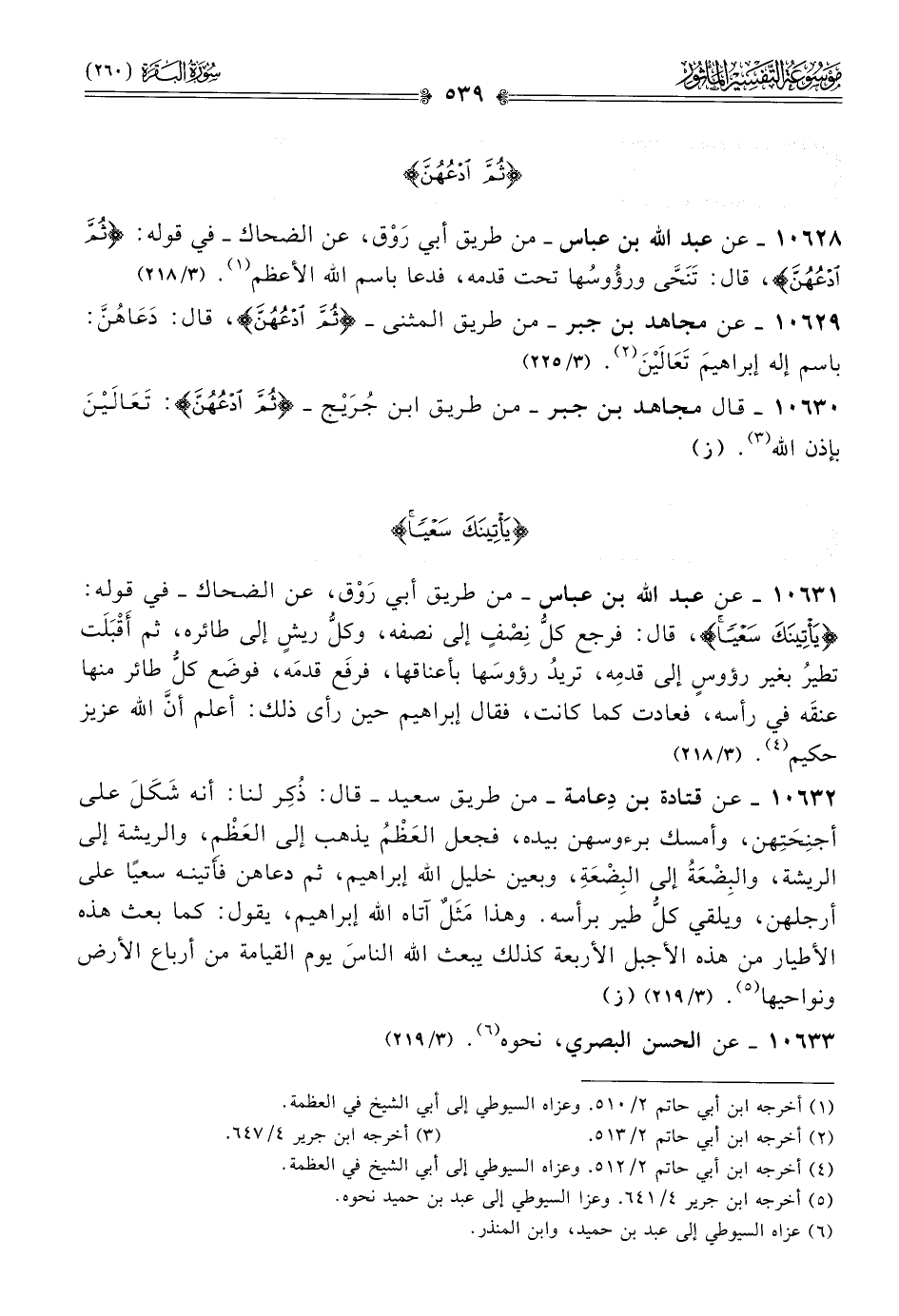 ١٠٦٣١ - عن عبد الله بن عباس -من طريق أبي رَوْق، عن الضحاك- في قوله: {يأتينك سعيا}، قال: فرجع كلُّ نِصْفٍ إلى نصفه، وكلُّ ريشٍ إلى طائره، ثم أقْبَلَت تطيرُ بغير رؤوسٍ إلى قدمِه، تريدُ رؤوسَها بأعناقها، فرفَع قدمَه، فوضَع كلُّ طائر منها عنقَه في رأسه، فعادت كما كانت، فقال إبراهيم حين رأى ذلك: أعلم أنّ الله عزيز حكيم (¬٤). (٣/ ٢١٨)