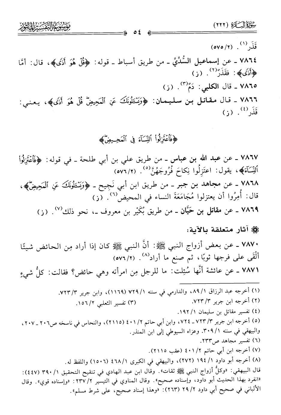 ٧٨٦٦ - قال مقاتل بن سليمان: {ويَسْئَلُونَكَ عَنِ المَحِيضِ قُلْ هُوَ أذىً}، يعني: قَذَر (¬٤). (ز)
