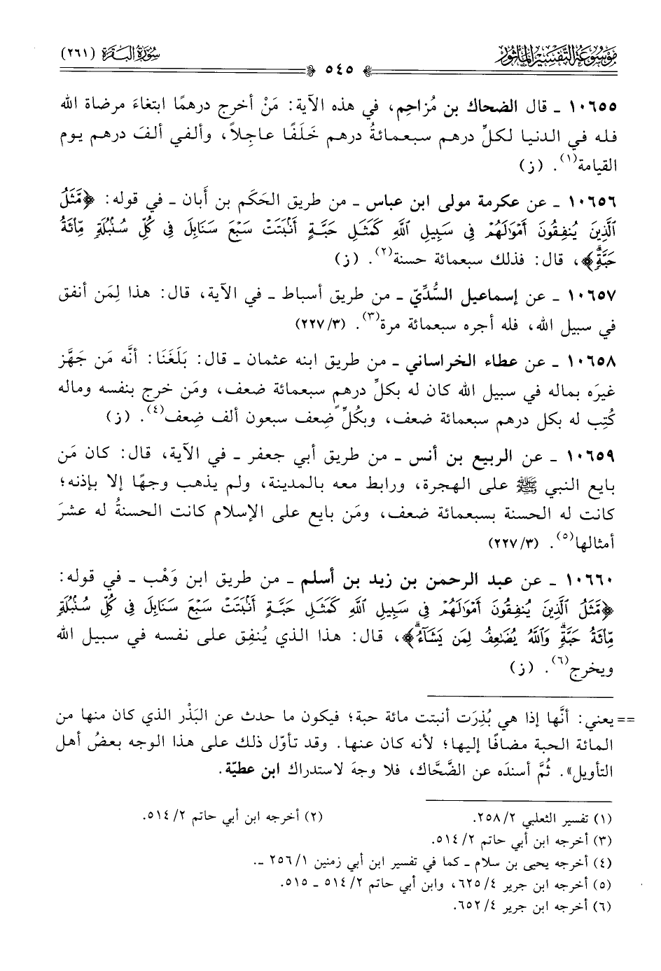 ١٠٦٥٧ - عن إسماعيل السُّدِّيّ -من طريق أسباط- في الآية، قال: هذا لِمَن أنفق في سبيل الله، فله أجره سبعمائة مرة (¬٣). (٣/ ٢٢٧)