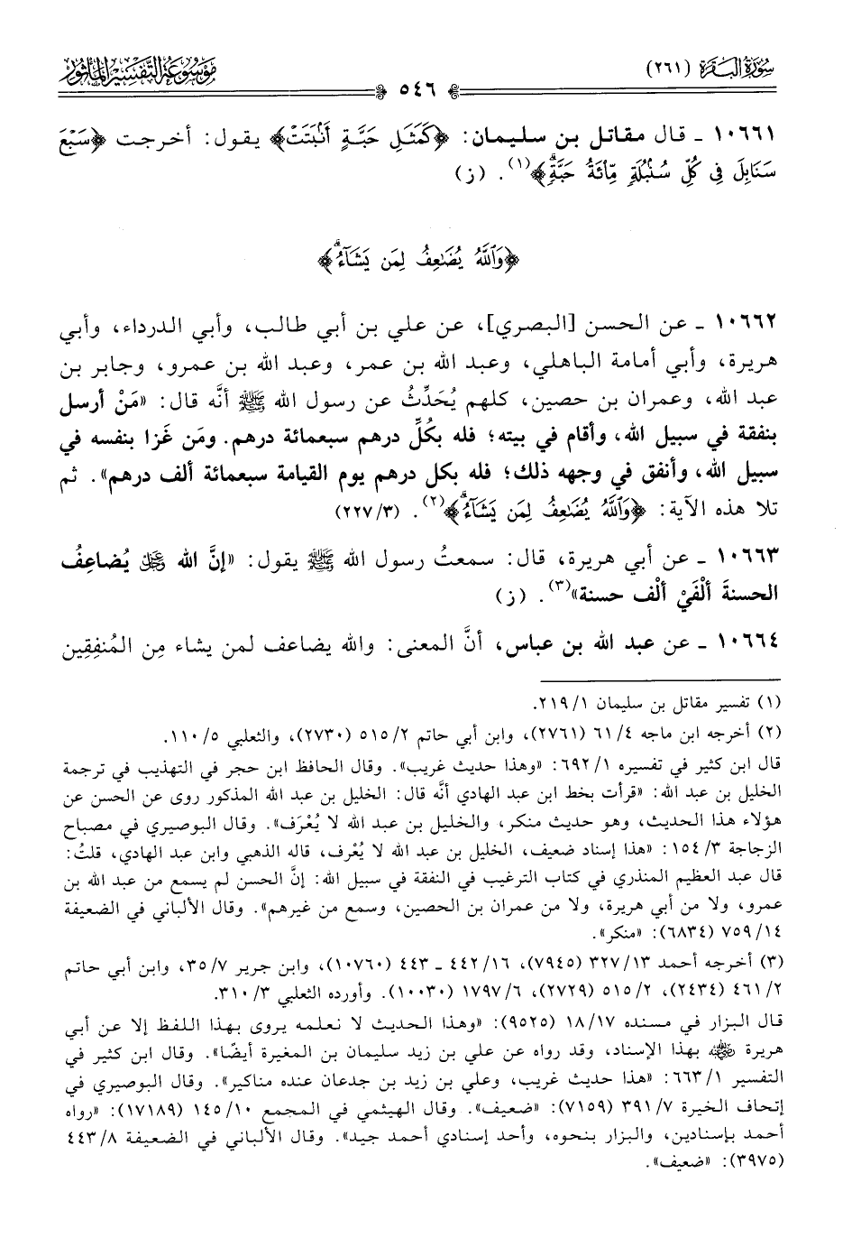 ١٠٦٦٤ - عن عبد الله بن عباس، أنّ المعنى: والله يضاعف لمن يشاء مِن المُنفِقِين