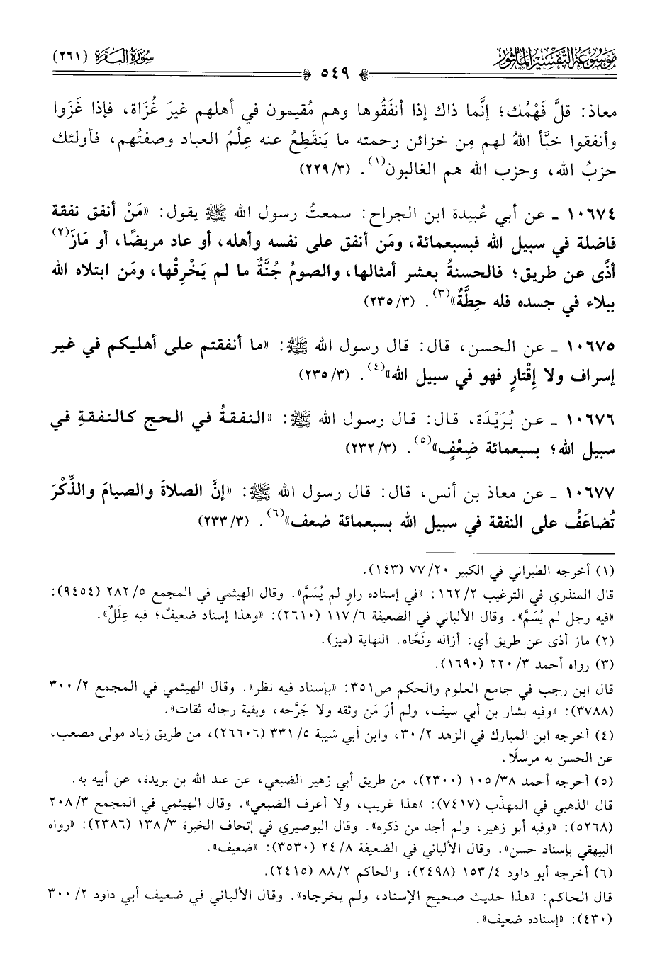 معاذ: قلَّ فَهْمُك؛ إنّما ذاك إذا أنفَقُوها وهم مُقيمون في أهلهم غيرَ غُزاة، فإذا غَزَوا وأنفقوا خبَّأ اللهُ لهم مِن خزائن رحمته ما يَنقَطِعُ عنه عِلْمُ العباد وصفتُهم، فأولئك حزبُ الله، وحزب الله هم الغالبون (¬١). (٣/ ٢٢٩)
