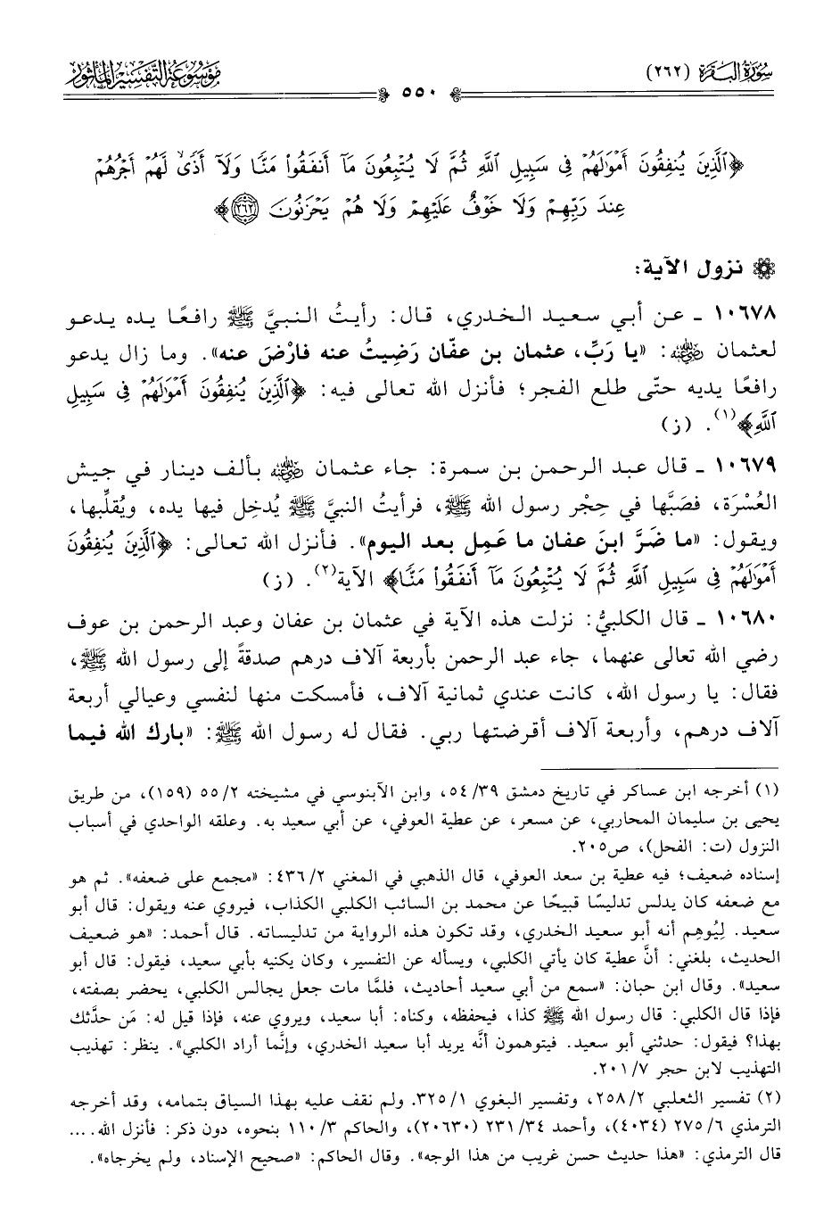 ١٠٦٧٩ - قال عبد الرحمن بن سمرة: جاء عثمان? بألف دينار في جيش العُسْرَة، فصَبَّها في حِجْر رسول الله - صلى الله عليه وسلم -، فرأيتُ النبيَّ - صلى الله عليه وسلم - يُدخِل فيها يده، ويُقلِّبها، ويقول: «ما ضَرَّ ابنَ عفان ما عَمِل بعد اليوم». فأنزل الله تعالى: {الَّذِينَ يُنْفِقُونَ أمْوالَهُمْ فِي سَبِيلِ اللَّهِ ثُمَّ لا يُتْبِعُونَ ما أنْفَقُوا مَنًّا} الآية (¬٢). (ز)