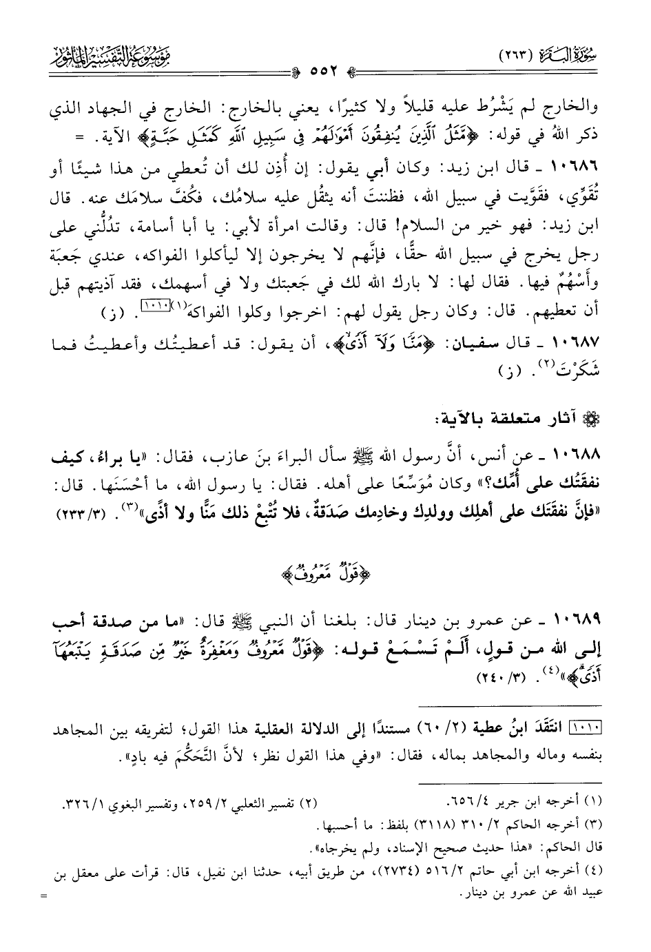 ١٠٦٨٩ - عن عمرو بن دينار قال: بلغنا أن النبي - صلى الله عليه وسلم - قال: «ما من صدقة أحب إلى الله من قولٍ، ألَمْ تَسْمَعْ قوله: {قول معروف ومغفرة خير من صدقة يتبعها أذى}» (¬٤). (٣/ ٢٤٠)