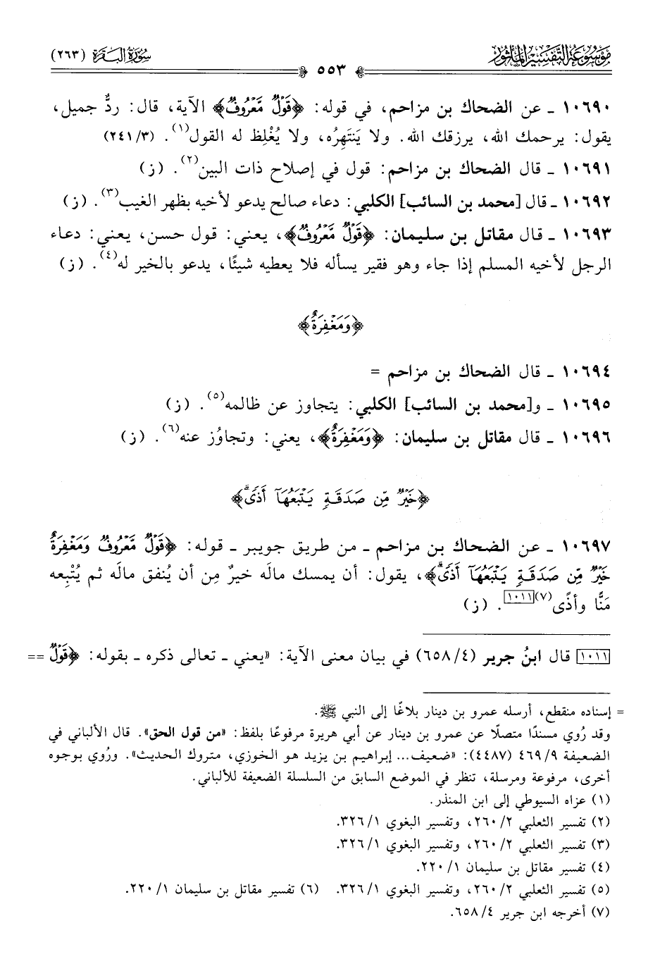 [١٠١١] قال ابنُ جرير (٤/ ٦٥٨) في بيان معنى الآية: «يعني -تعالى ذكره- بقوله: {قول معروف}: قولٌ جميلٌ، ودعاء الرجل لأخيه المسلم، {ومغفرة} يعني: وسترٌ منه عليه، لما عَلِم من خَلَّتِه وسوءِ حالتِه {خير} عند الله {من صدقة} يتصدقها عليه {يتبعها أذى} يعني: يشتكيه عليها، ويُؤْذِيه بسببِها». مستندًا إلى قولِ الضحاك، ولم يورد غيره.