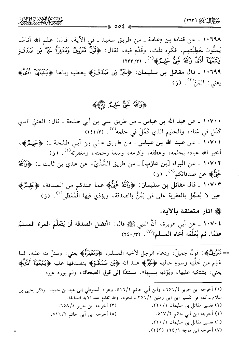 ١٠٦٩٨ - عن قتادة بن دِعامة -من طريق سعيد- في الآية، قال: علم الله أناسًا يَمنُّون بعَطِيَّتهم، فكَرِه ذلك، وقَدَّم فيه، فقال: {قَوْلٌ مَعْرُوفٌ ومَغْفِرَةٌ خَيْرٌ مِن صَدَقَةٍ يَتْبَعُها أذًى واللَّهُ غَنِيُّ حَلِيمٌ} (¬١). (٣/ ٢٣٣)
