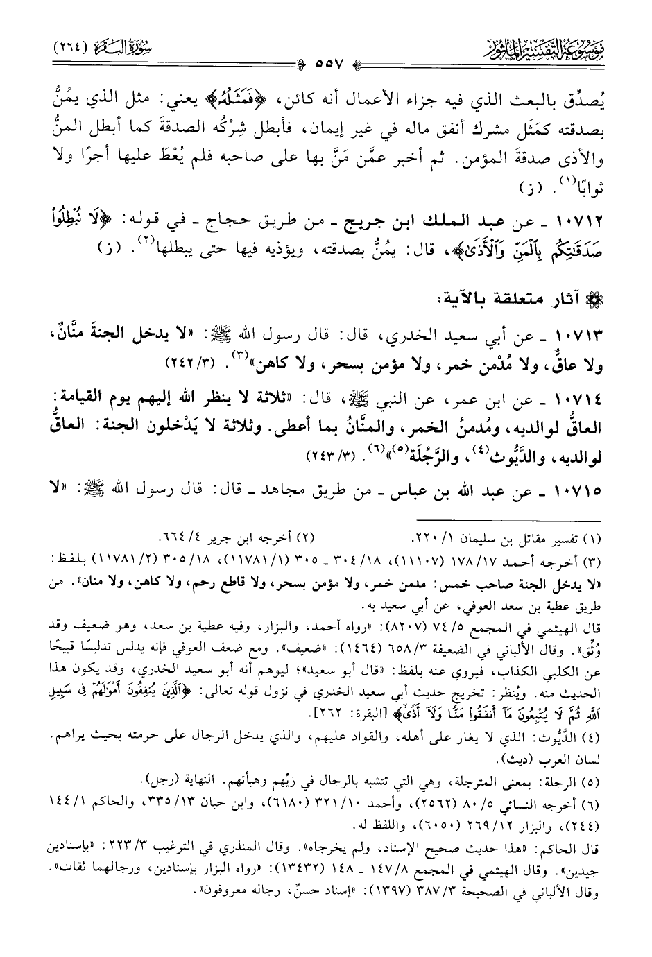 ١٠٧١٢ - عن عبد الملك ابن جريج -من طريق حجاج- في قوله: {لا تبطلوا صدقاتكم بالمن والأذى}، قال: يمُنُّ بصدقته، ويؤذيه فيها حتى يبطلها (¬٢). (ز)