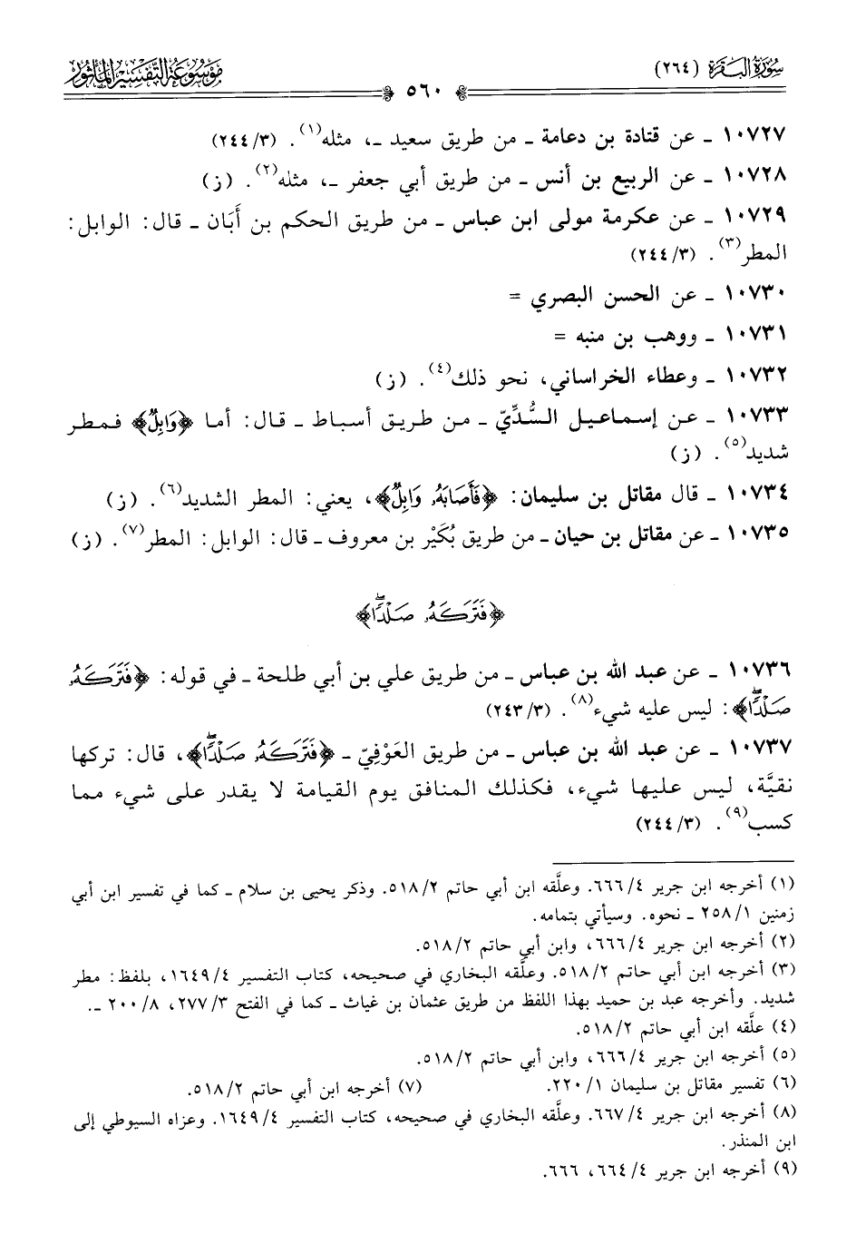 ١٠٧٣٧ - عن عبد الله بن عباس -من طريق العَوْفِيّ- {فتركه صلدا}، قال: تركها نقيَّة، ليس عليها شيء، فكذلك المنافق يوم القيامة لا يقدر على شيء مما كسب (¬٩). (٣/ ٢٤٤)