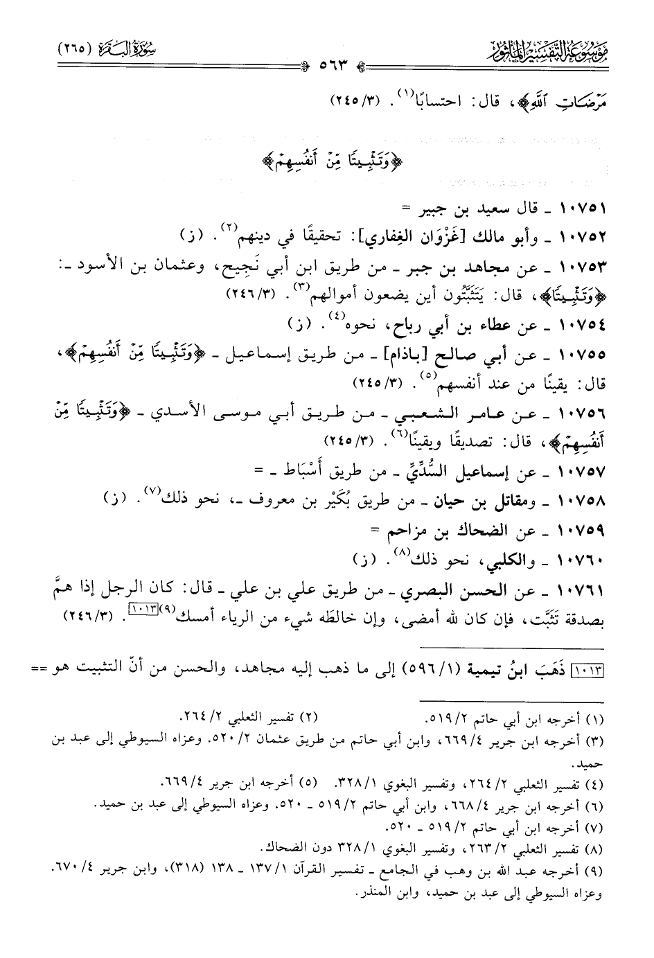 ١٠٧٥٣ - عن مجاهد بن جبر -من طريق ابن أبي نَجِيح، وعثمان بن الأسود-: {وتثبيتا}، قال: يَتَثَبَّتُون أين يضعون أموالهم (¬٣). (٣/ ٢٤٦)