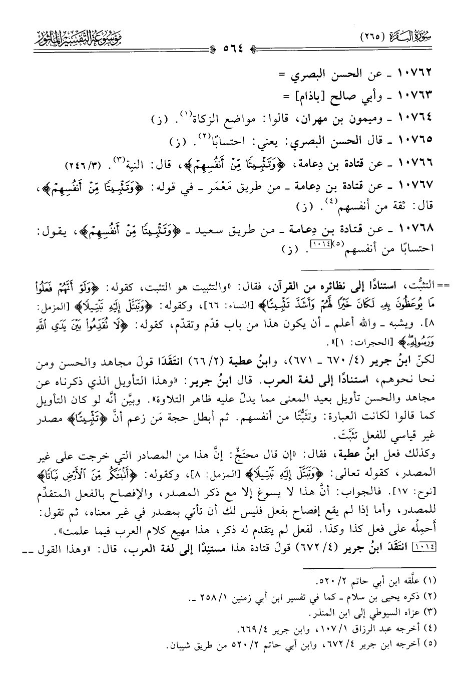[١٠١٤] انتَقَدَ ابنُ جرير (٤/ ٦٧٢) قولَ قتادة هذا مستنِدًا إلى لغة العرب، قال: «وهذا القول أيضًا قولٌ بعيد المعنى من معنى التثبيت؛ لأنّ التثبيت لا يعرف في شيء من الكلام بمعنى الاحتساب، إلا أن يكون أراد مفسِّرُه كذلك أن أنفُسَ المنفقين كانت مُحتسِبةً في تثبيتها أصحابها، فإن كان ذلك كان عنده معنى الكلام، فليس الاحتساب بمعنًى حينئذٍ للتثبيتِ فيُتَرْجَمَ عنه به».