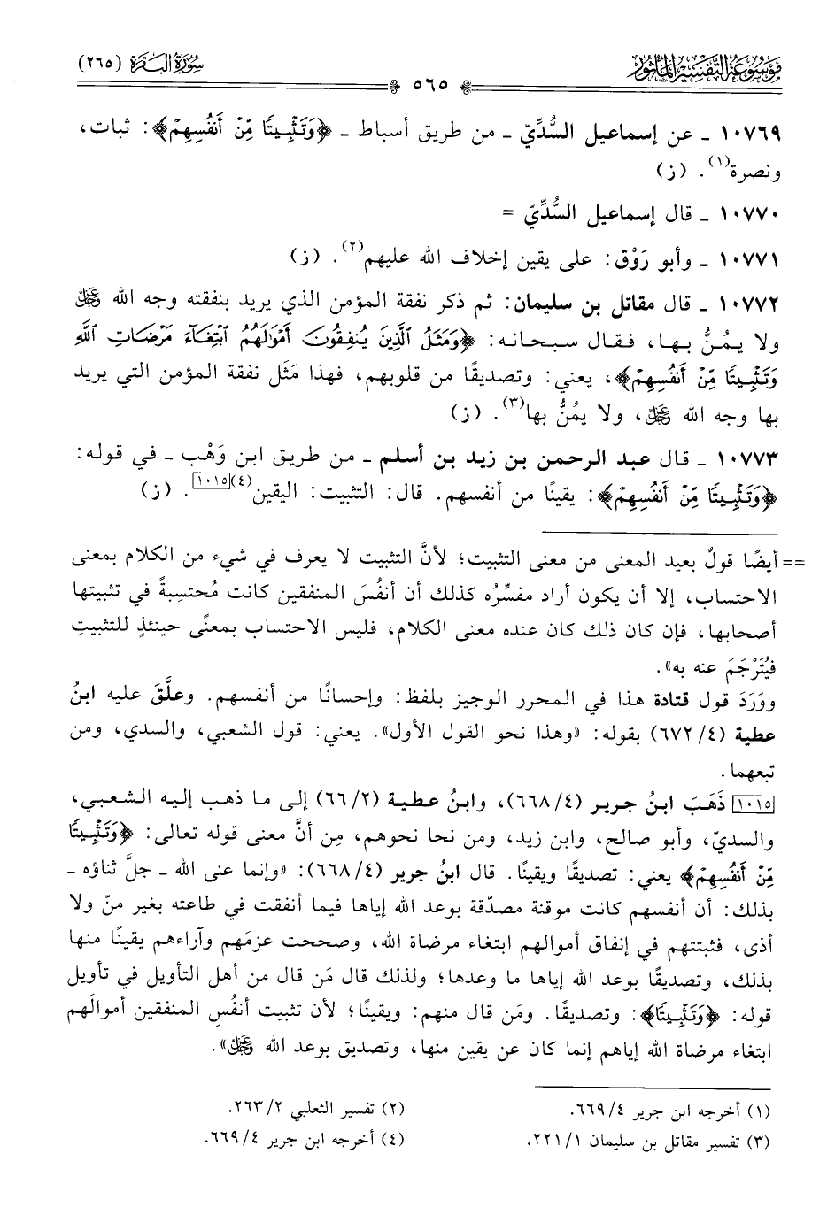 ١٠٧٧٣ - قال عبد الرحمن بن زيد بن أسلم -من طريق ابن وهْب- في قوله: {وتثبيتا من أنفسهم}: يقينًا من أنفسهم. قال: التثبيت: اليقين (¬٤) [١٠١٥]. (ز)