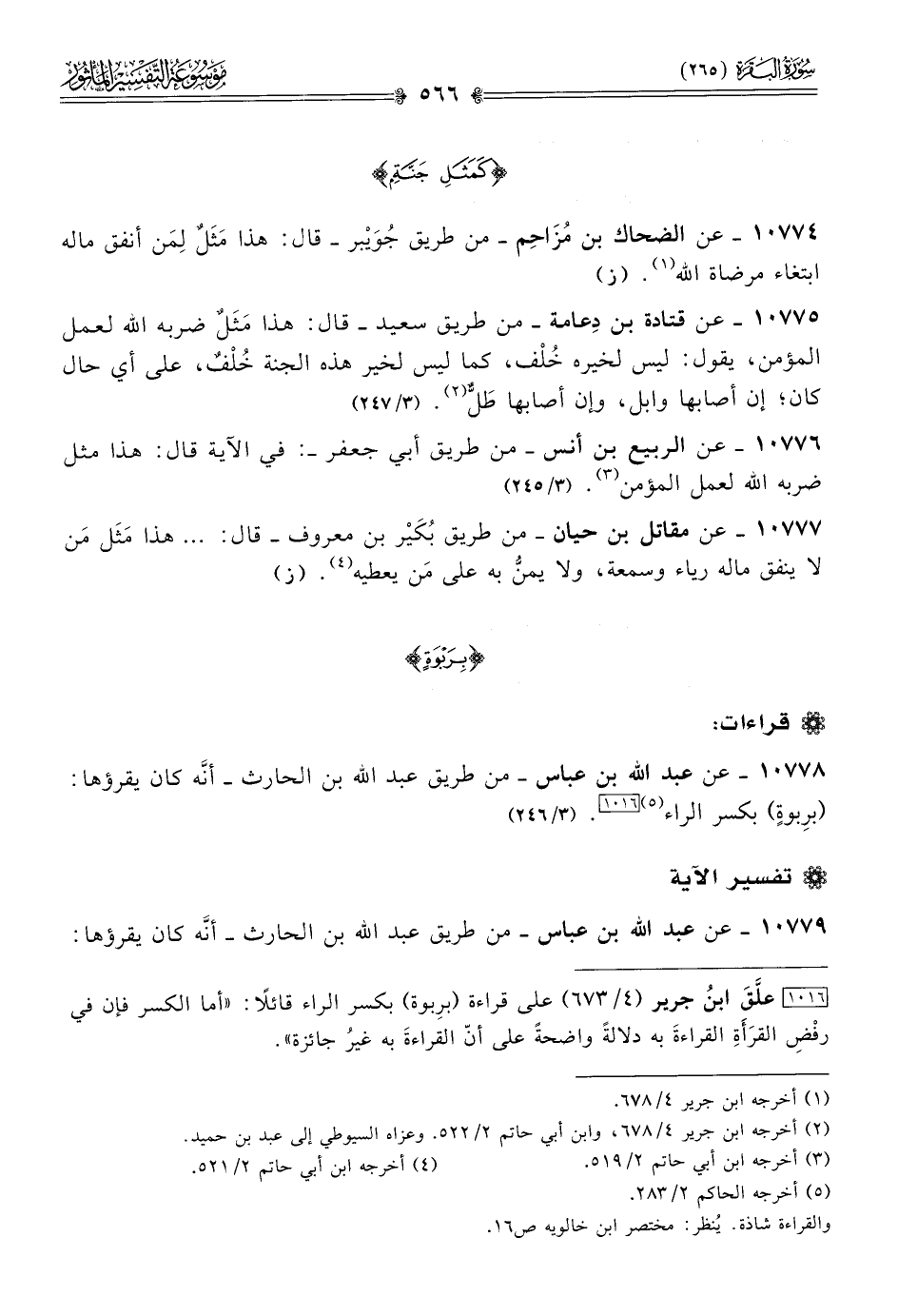[١٠١٦] علَّقَ ابنُ جرير (٤/ ٦٧٣) على قراءة (برِبوة) بكسر الراء قائلًا: «أما الكسر فإن في رفْضِ القرَأَةِ القراءةَ به دلالةً واضحةً على أنّ القراءةَ به غيرُ جائزة».