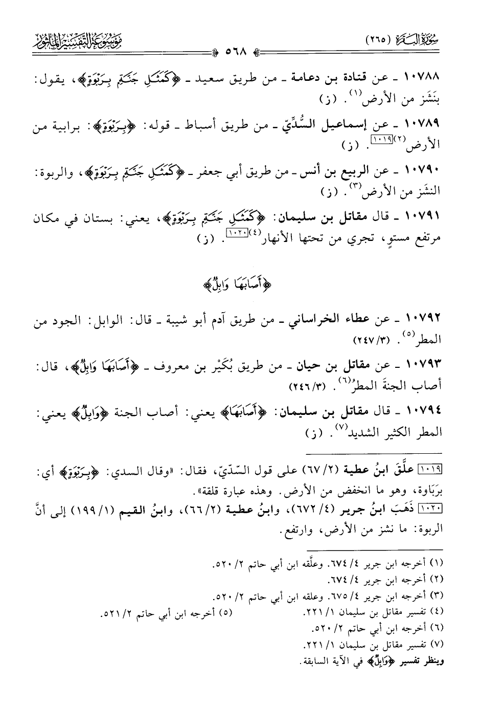 ١٠٧٩١ - قال مقاتل بن سليمان: {كمثل جنة بربوة}، يعني: بستان في مكان مرتفع مستوٍ، تجري من تحتها الأنهار (¬٤) [١٠٢٠]. (ز)