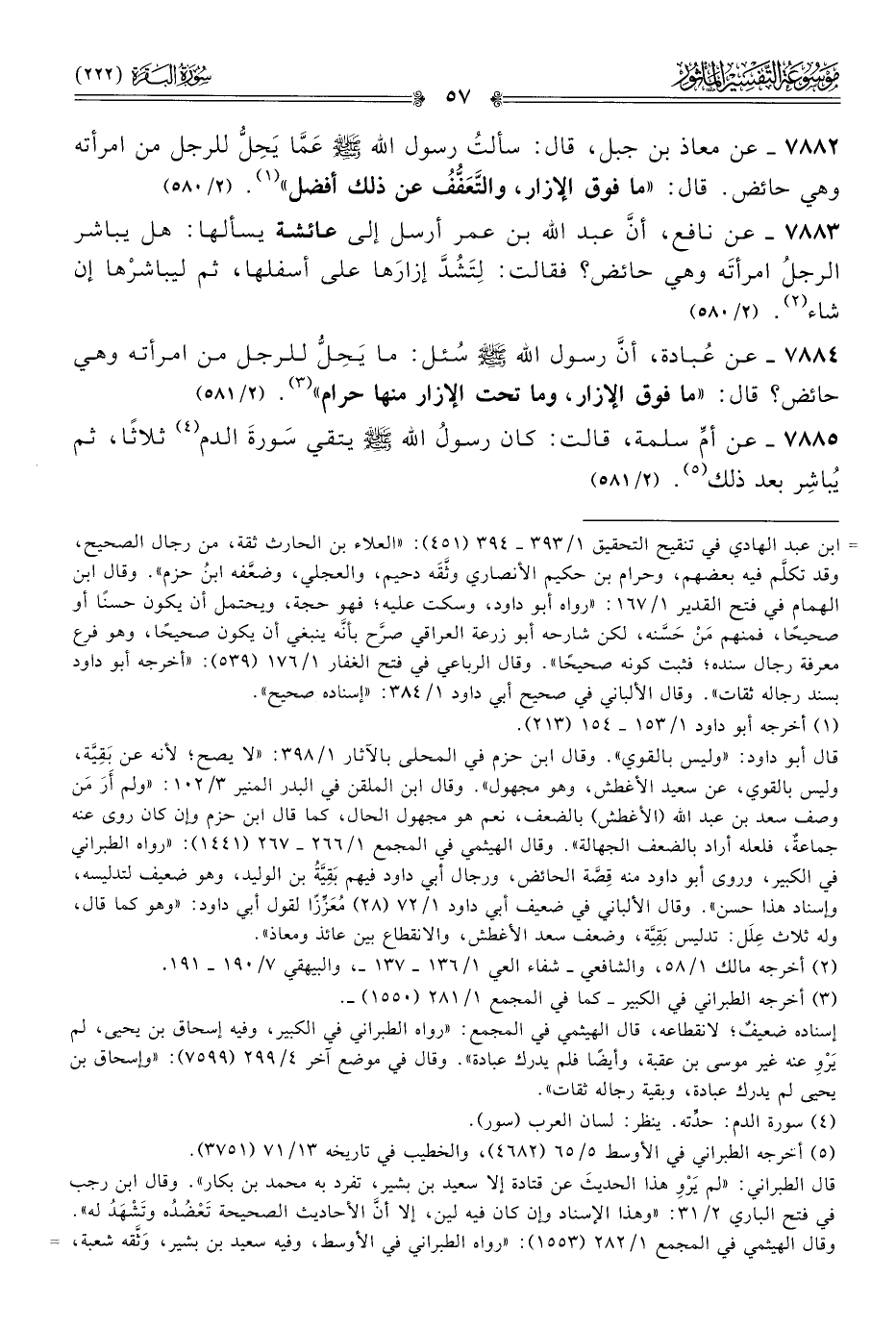 ٧٨٨٢ - عن معاذ بن جبل، قال: سألتُ رسول الله - صلى الله عليه وسلم - عَمّا يَحِلُّ للرجل من امرأته وهي حائض. قال: «ما فوق الإزار، والتَّعَفُّفُ عن ذلك أفضل» (¬١). (٢/ ٥٨٠)