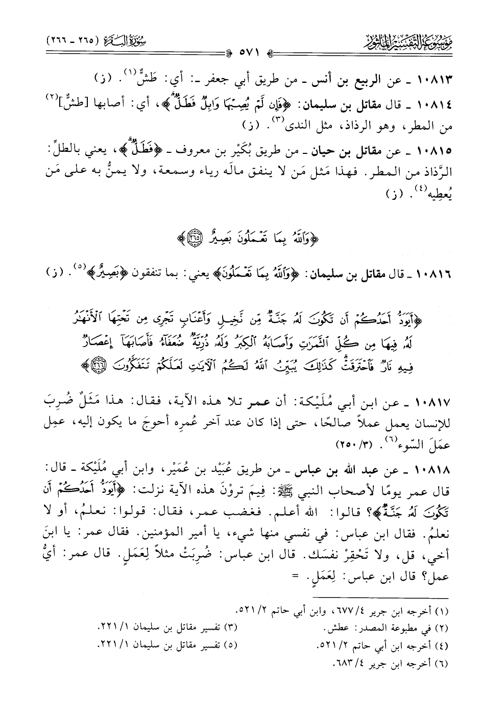 ١٠٨١٥ - عن مقاتل بن حيان -من طريق بُكَيْر بن معروف- {فطل}، يعني بالطلِّ: الرَّذاذ من المطر. فهذا مَثل مَن لا ينفق مالَه رياء وسمعة، ولا يمنُّ به على مَن يُعطِيه (¬٤). (ز)