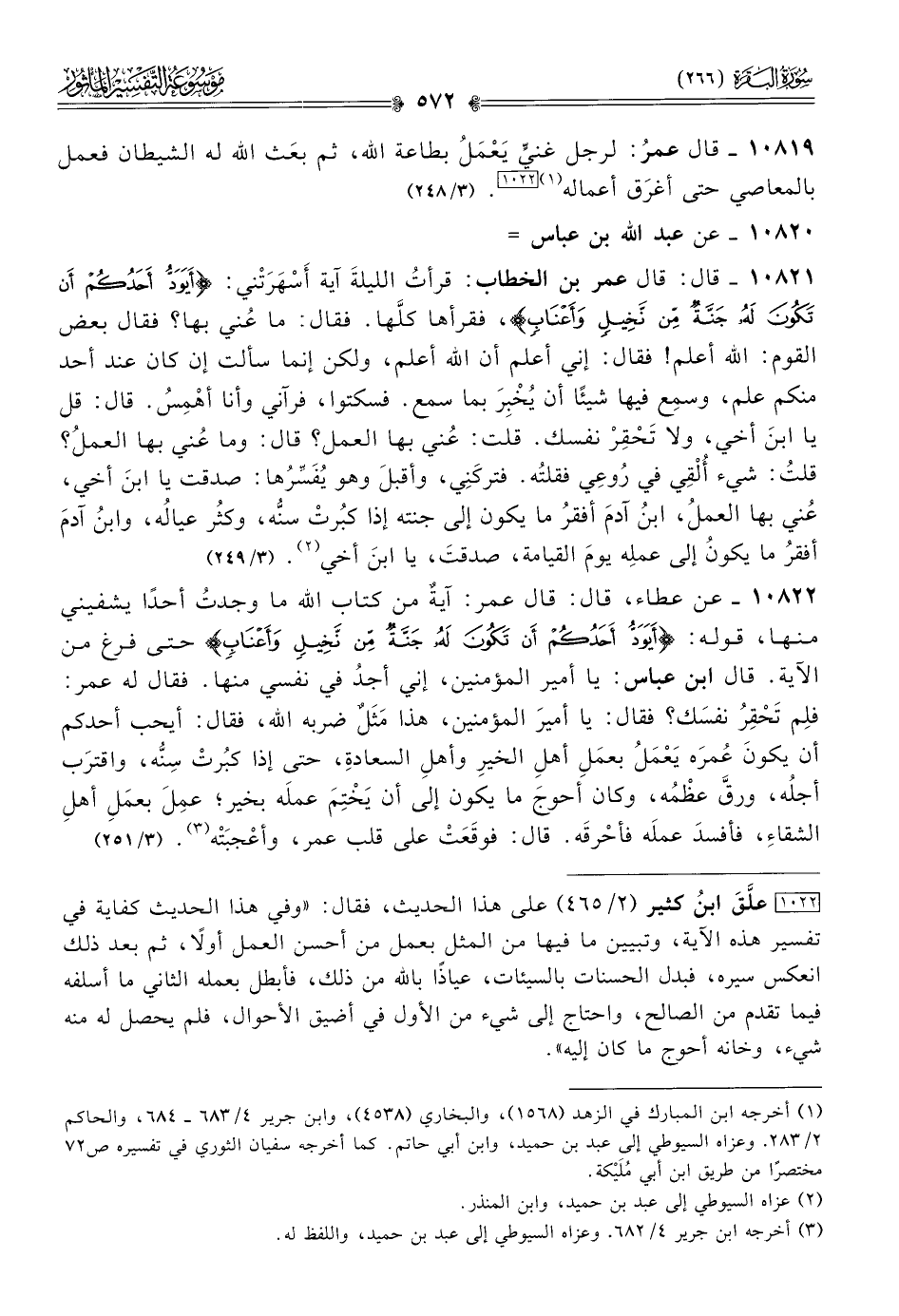 [١٠٢٢] علَّقَ ابنُ كثير (٢/ ٤٦٥) على هذا الحديث، فقال: «وفي هذا الحديث كفاية في تفسير هذه الآية، وتبيين ما فيها من المثل بعمل من أحسن العمل أولًا، ثم بعد ذلك انعكس سيره، فبدل الحسنات بالسيئات، عياذًًا بالله من ذلك، فأبطل بعمله الثاني ما أسلفه فيما تقدم من الصالح، واحتاج إلى شيء من الأول في أضيق الأحوال، فلم يحصل له منه شيء، وخانه أحوج ما كان إليه».