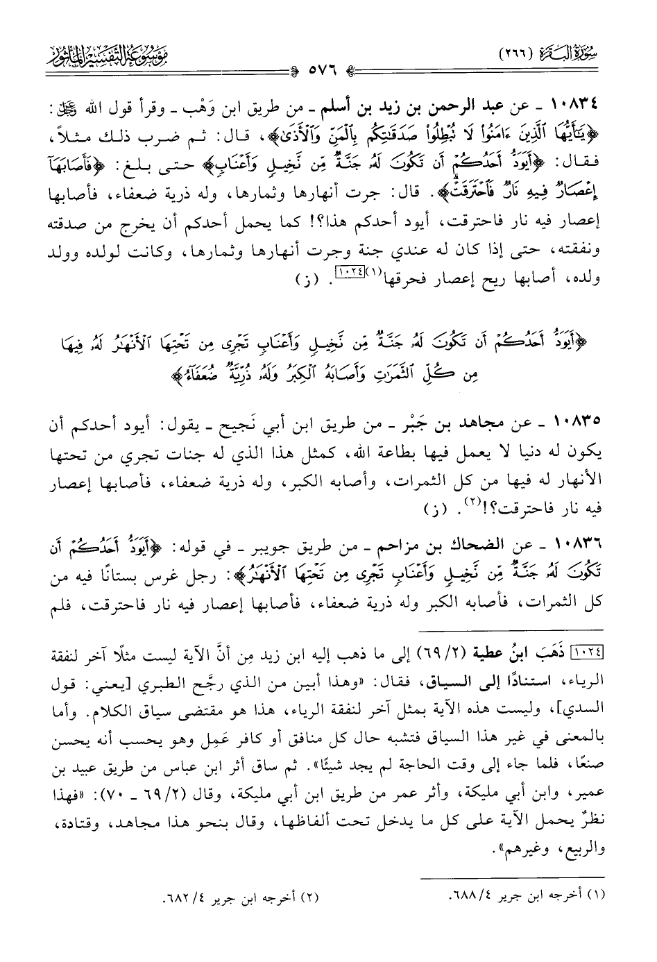 ١٠٨٣٤ - عن عبد الرحمن بن زيد بن أسلم -من طريق ابن وهْب- وقرأ قول الله - عز وجل -: {يا أيها الذين آمنوا لا تبطلوا صدقاتكم بالمن والأذى}، قال: ثم ضرب ذلك مثلًا، فقال: {أيود أحدكم أن تكون له جنة من نخيل وأعناب} حتى بلغ: {فأصابها إعصار فيه نار فاحترقت}. قال: جرت أنهارها وثمارها، وله ذرية ضعفاء، فأصابها إعصار فيه نار فاحترقت، أيود أحدكم هذا؟! كما يحمل أحدكم أن يخرج من صدقته ونفقته، حتى إذا كان له عندي جنة وجرت أنهارها وثمارها، وكانت لولده وولد ولده، أصابها ريح إعصار فحرقها (¬١) [١٠٢٤]. (ز)