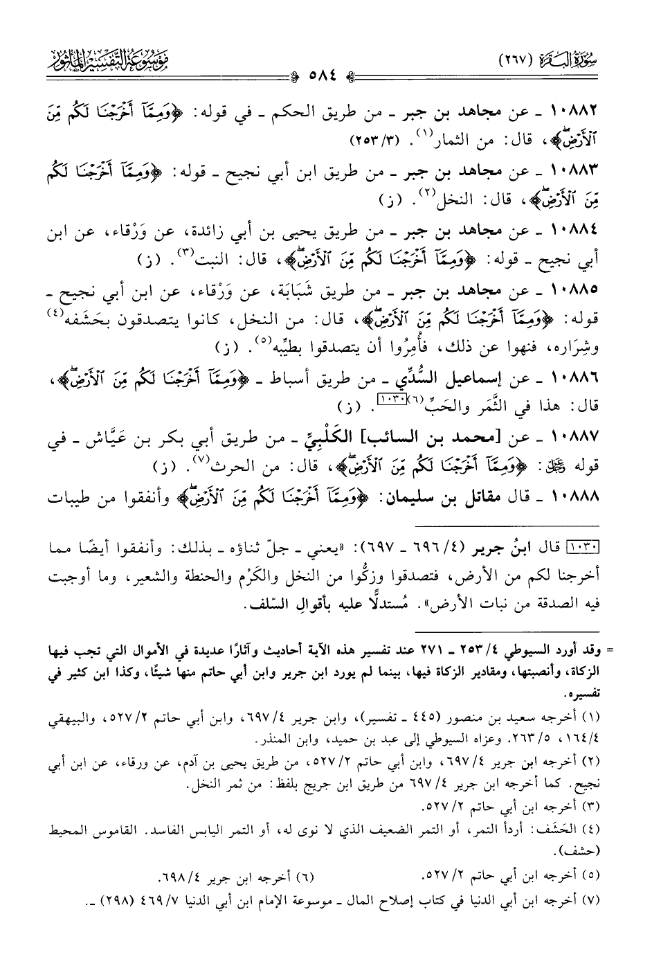 [١٠٣٠] قال ابنُ جرير (٤/ ٦٩٦ - ٦٩٧): «يعني -جلّ ثناؤه- بذلك: وأنفقوا أيضًا مما أخرجنا لكم من الأرض، فتصدقوا وزكُّوا من النخل والكَرْم والحنطة والشعير، وما أوجبت فيه الصدقة من نبات الأرض». مُستدلًّا عليه بأقوالِ السّلف.