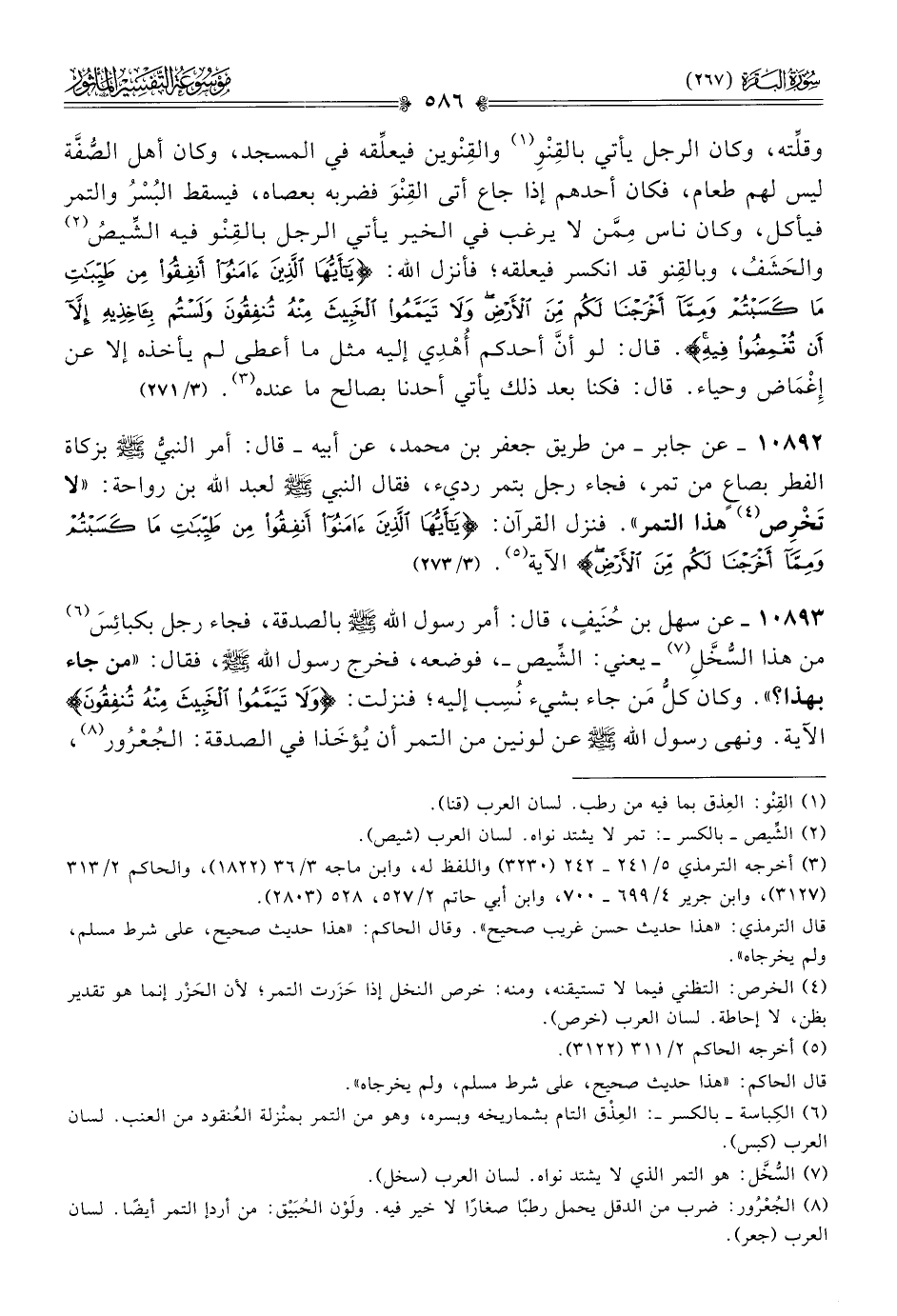 ١٠٨٩٢ - عن جابر -من طريق جعفر بن محمد، عن أبيه- قال: أمر النبيُّ - صلى الله عليه وسلم - بزكاة الفطر بصاعٍ من تمر، فجاء رجل بتمر رديء، فقال النبي - صلى الله عليه وسلم - لعبد الله بن رواحة: «لا تَخْرِص (¬٤) هذا التمر». فنزل القرآن: {يا أيها الذين آمنوا أنفقوا من طيبات ما كسبتم ومما أخرجنا لكم من الأرض} الآية (¬٥). (٣/ ٢٧٣)