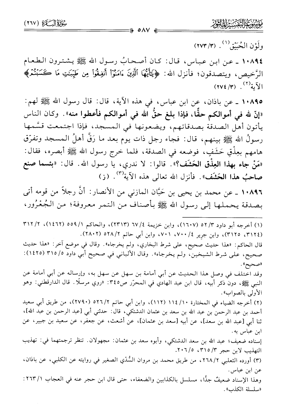 ١٠٨٩٤ - عن ابن عباس، قال: كان أصحابُ رسول الله - صلى الله عليه وسلم - يشترون الطعام الرَّخيص، ويتصدقون؛ فأنزل الله: {يا أيها الذين آمنوا أنفقوا من طيبات ما كسبتم} الآية (¬٢). (٣/ ٢٧٤)
