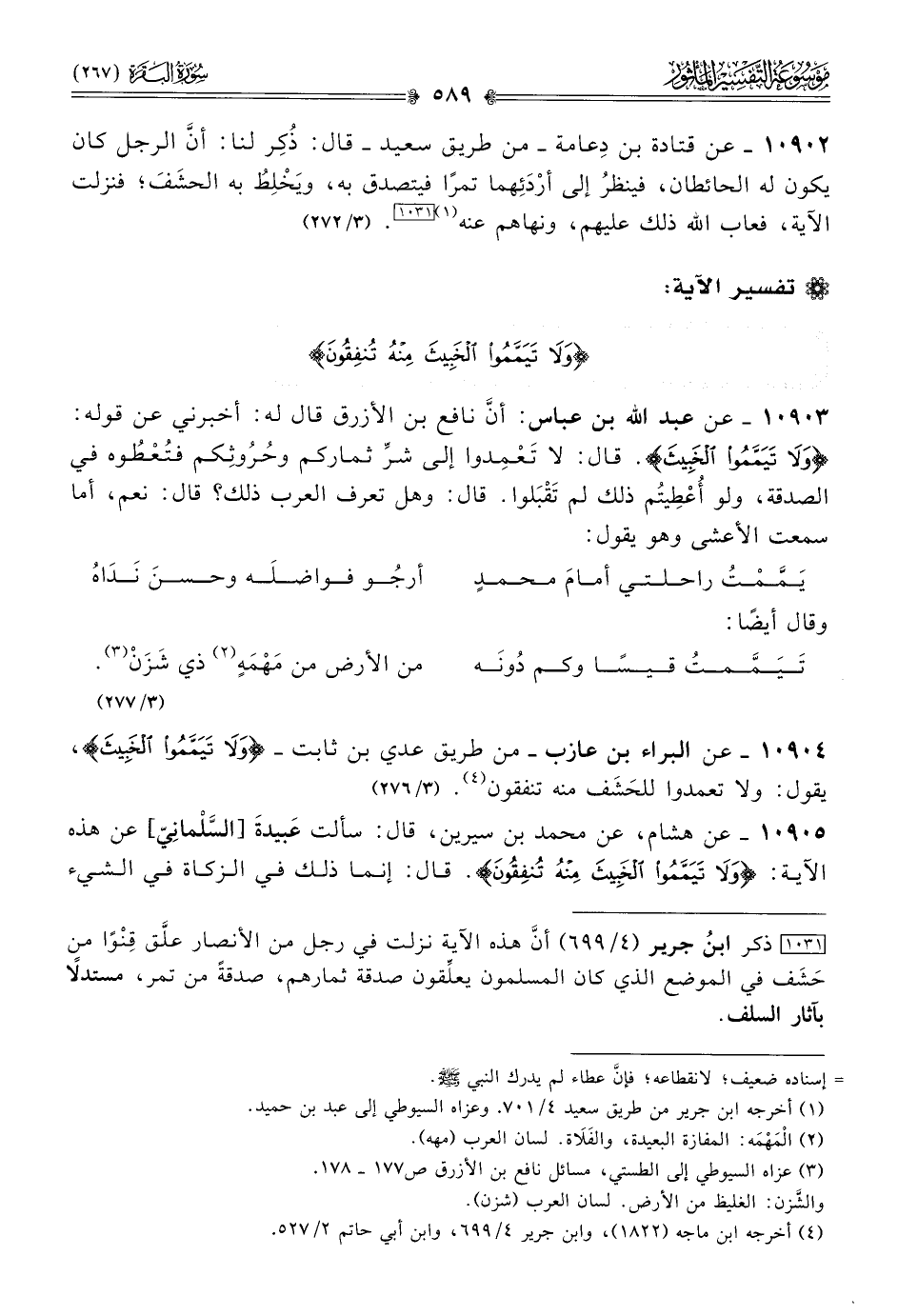 ١٠٩٠٣ - عن عبد الله بن عباس: أنّ نافع بن الأزرق قال له: أخبرني عن قوله: {ولا تيمموا الخبيث}. قال: لا تَعْمِدوا إلى شرِّ ثماركم وحُرُوثِكم فتُعْطُوه في الصدقة، ولو أُعْطِيتُم ذلك لم تَقْبَلوا. قال: وهل تعرف العرب ذلك؟ قال: نعم، أما سمعت الأعشى وهو يقول: