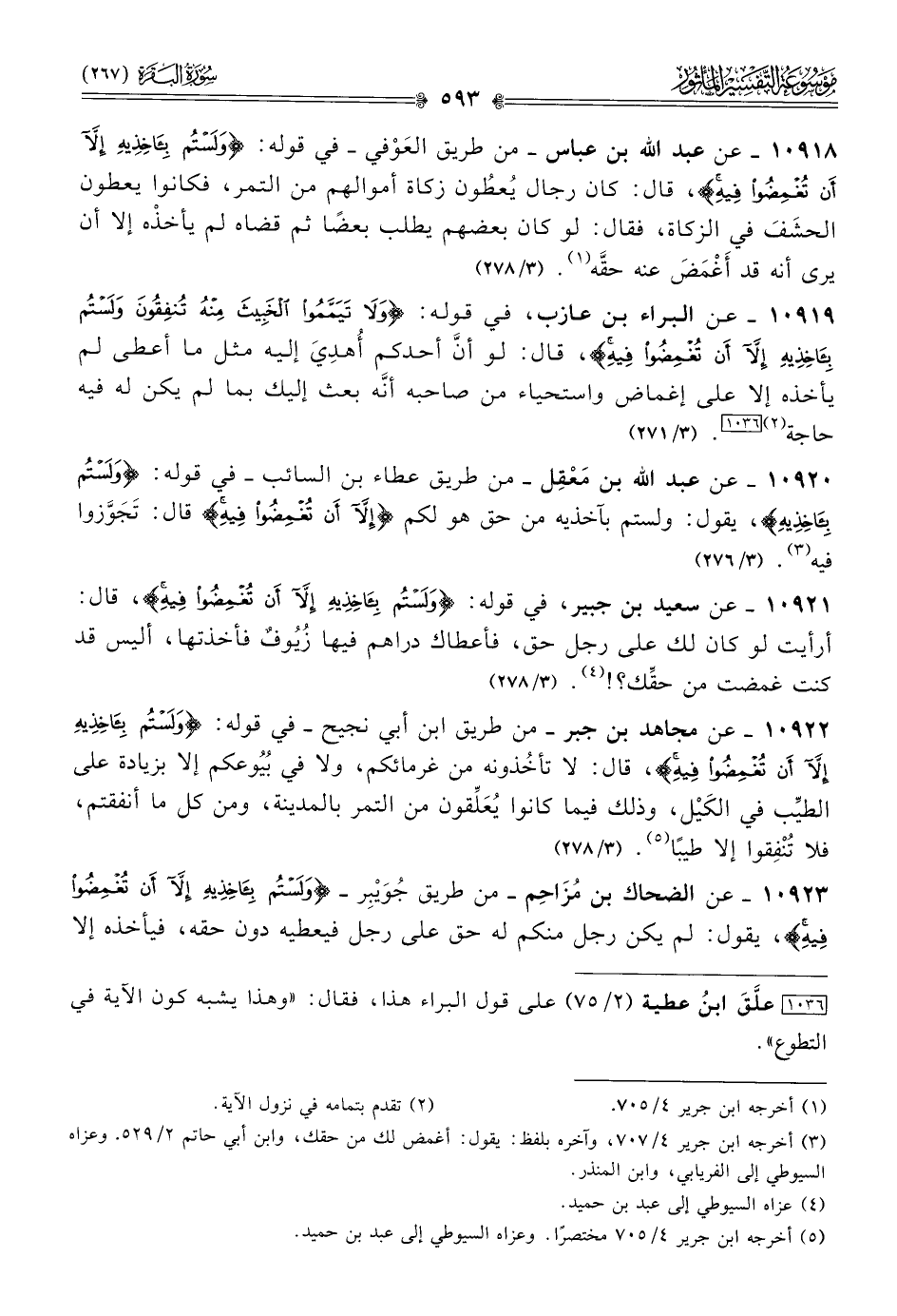 ١٠٩١٨ - عن عبد الله بن عباس -من طريق العَوْفي- في قوله: {ولستم بآخذيه إلا أن تغمضوا فيه}، قال: كان رجال يُعطُون زكاة أموالهم من التمر، فكانوا يعطون الحشَفَ في الزكاة، فقال: لو كان بعضهم يطلب بعضًا ثم قضاه لم يأخذْه إلا أن يرى أنه قد أغْمَضَ عنه حقَّه (¬١). (٣/ ٢٧٨)