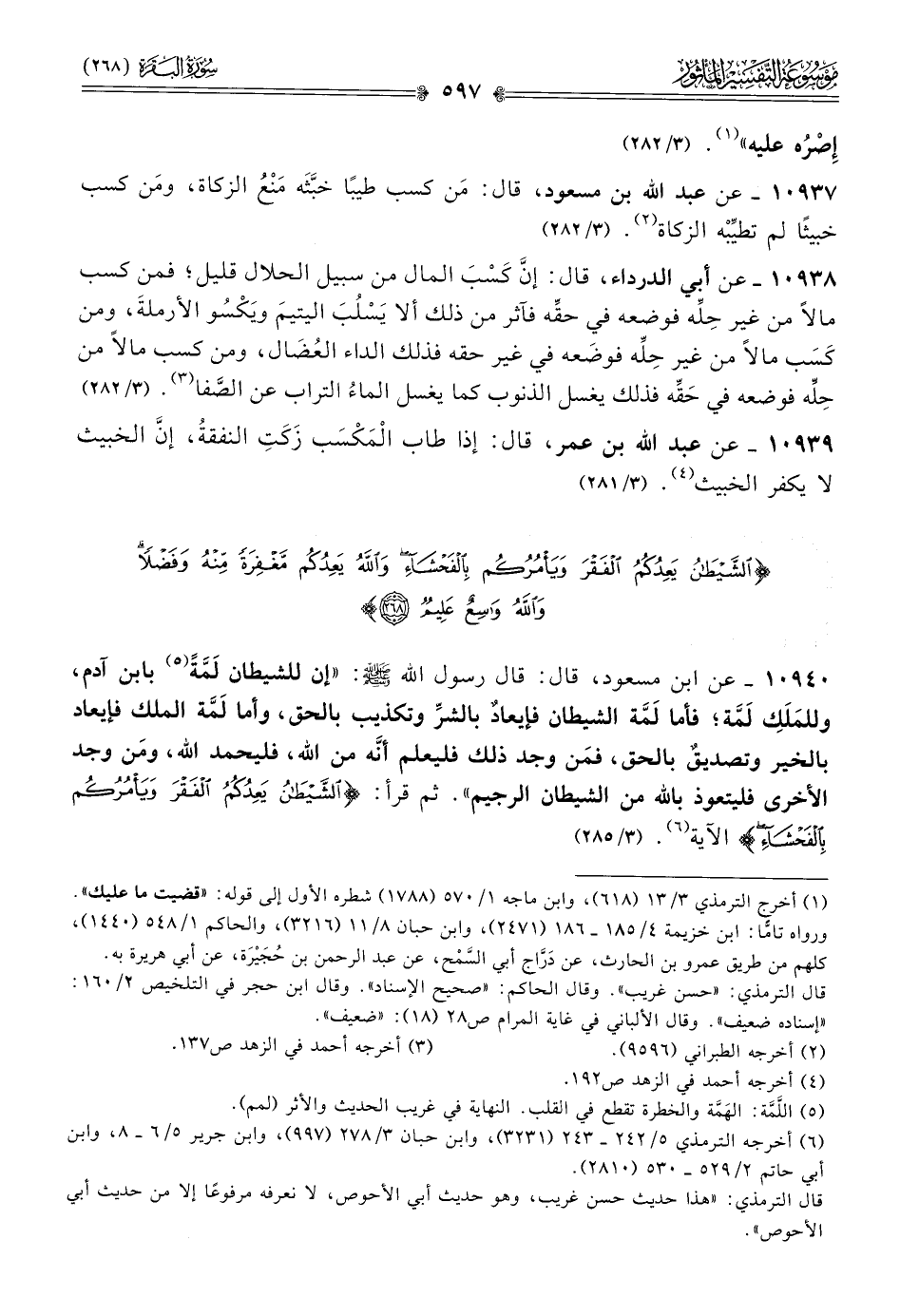 ١٠٩٤٠ - عن ابن مسعود، قال: قال رسول الله - صلى الله عليه وسلم -: «إن للشيطان لَمَّةً (¬٥) بابن آدم، وللمَلَكِ لَمَّة؛ فأما لَمَّة الشيطان فإيعادٌ بالشرِّ وتكذيب بالحق، وأما لَمَّة الملك فإيعاد بالخير وتصديقٌ بالحق، فمَن وجد ذلك فليعلم أنّه من الله، فليحمد الله، ومَن وجد الأخرى فليتعوذ بالله من الشيطان الرجيم». ثم قرأ: {الشيطان يعدكم الفقر ويأمركم بالفحشاء} الآية (¬٦). (٣/ ٢٨٥)