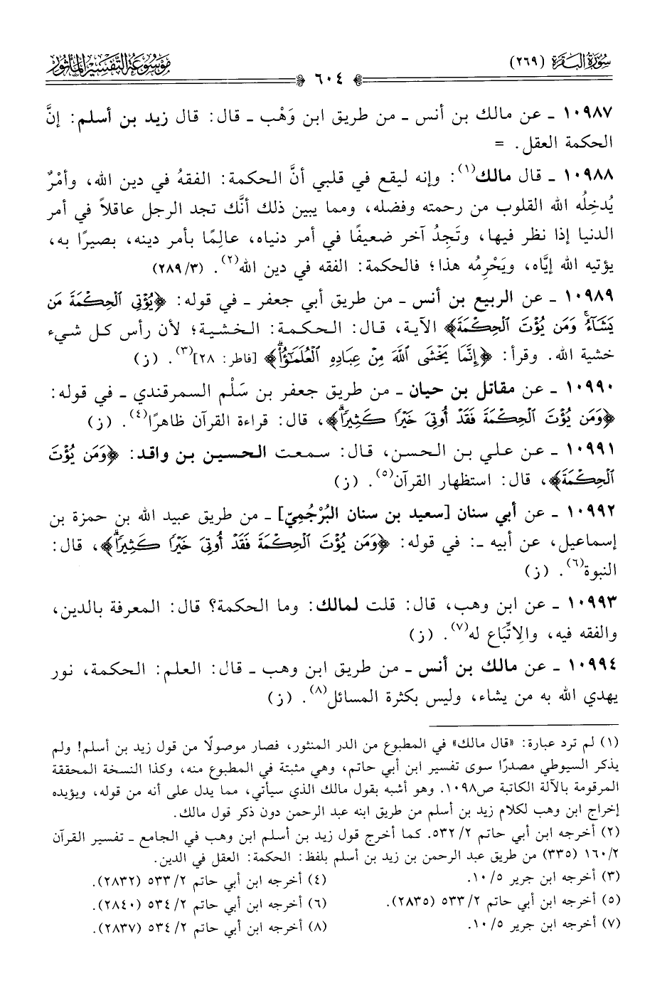 (¬٢) أخرجه ابن أبي حاتم ٢/ ٥٣٢. كما أخرج قول زيد بن أسلم ابن وهب في الجامع -تفسير القرآن ٢/ ١٦٠ (٣٣٥) من طريق عبد الرحمن بن زيد بن أسلم بلفظ: الحكمة: العقل في الدين.