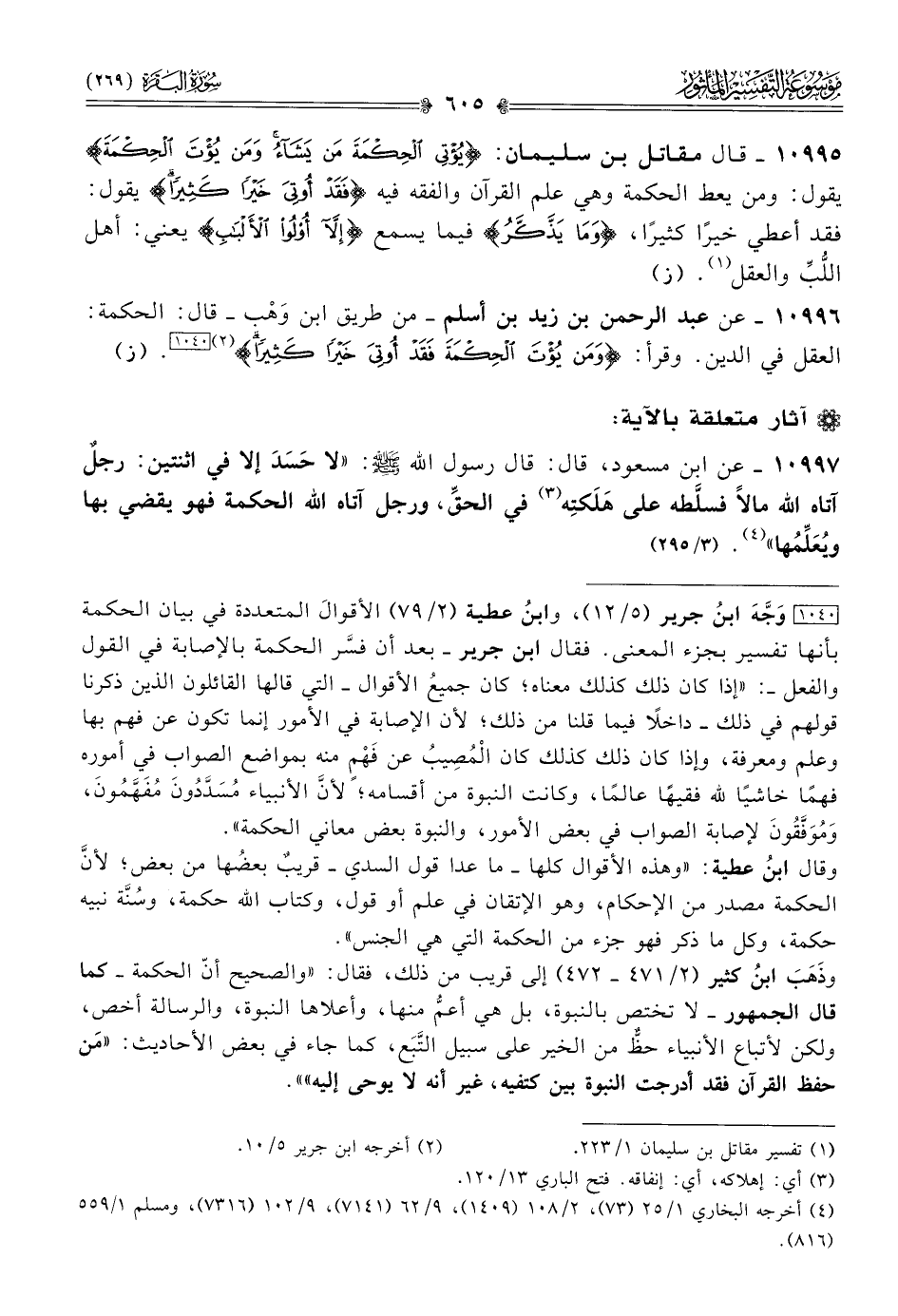 ١٠٩٩٦ - عن عبد الرحمن بن زيد بن أسلم -من طريق ابن وهْب- قال: الحكمة: العقل في الدين. وقرأ: {ومن يؤت الحكمة فقد أوتي خيرا كثيرا} (¬٢) [١٠٤٠]. (ز)