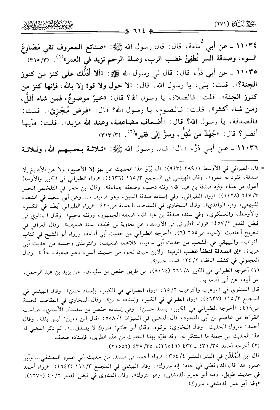 ١١٠٣٤ - عن أبي أُمامة، قال: قال رسول الله - صلى الله عليه وسلم -: «صنائع المعروف تقي مَصارِعَ السوء، وصدقة السر تُطْفِئُ غضب الرب، وصلة الرحم تزيد في العمر» (¬١). (٣/ ٣١٥)