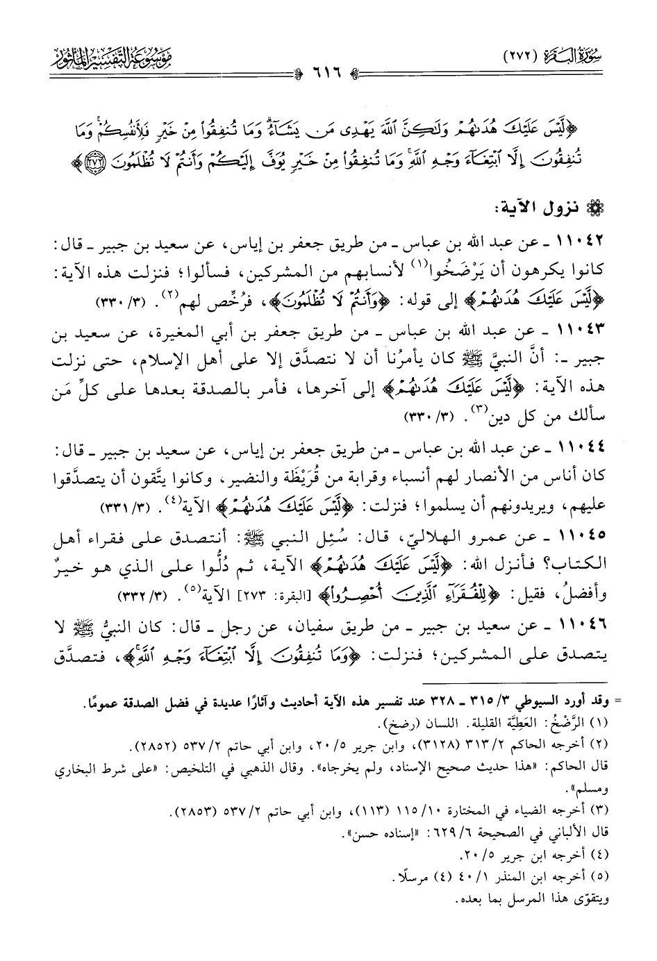 ١١٠٤٢ - عن عبد الله بن عباس -من طريق جعفر بن إياس، عن سعيد بن جبير- قال: كانوا يكرهون أن يَرْضَخُوا (¬١) لأنسابهم من المشركين، فسألوا؛ فنزلت هذه الآية: {ليس عليك هداهم} إلى قوله: {وأنتم لا تظلمون}، فرُخِّص لهم (¬٢). (٣/ ٣٣٠)