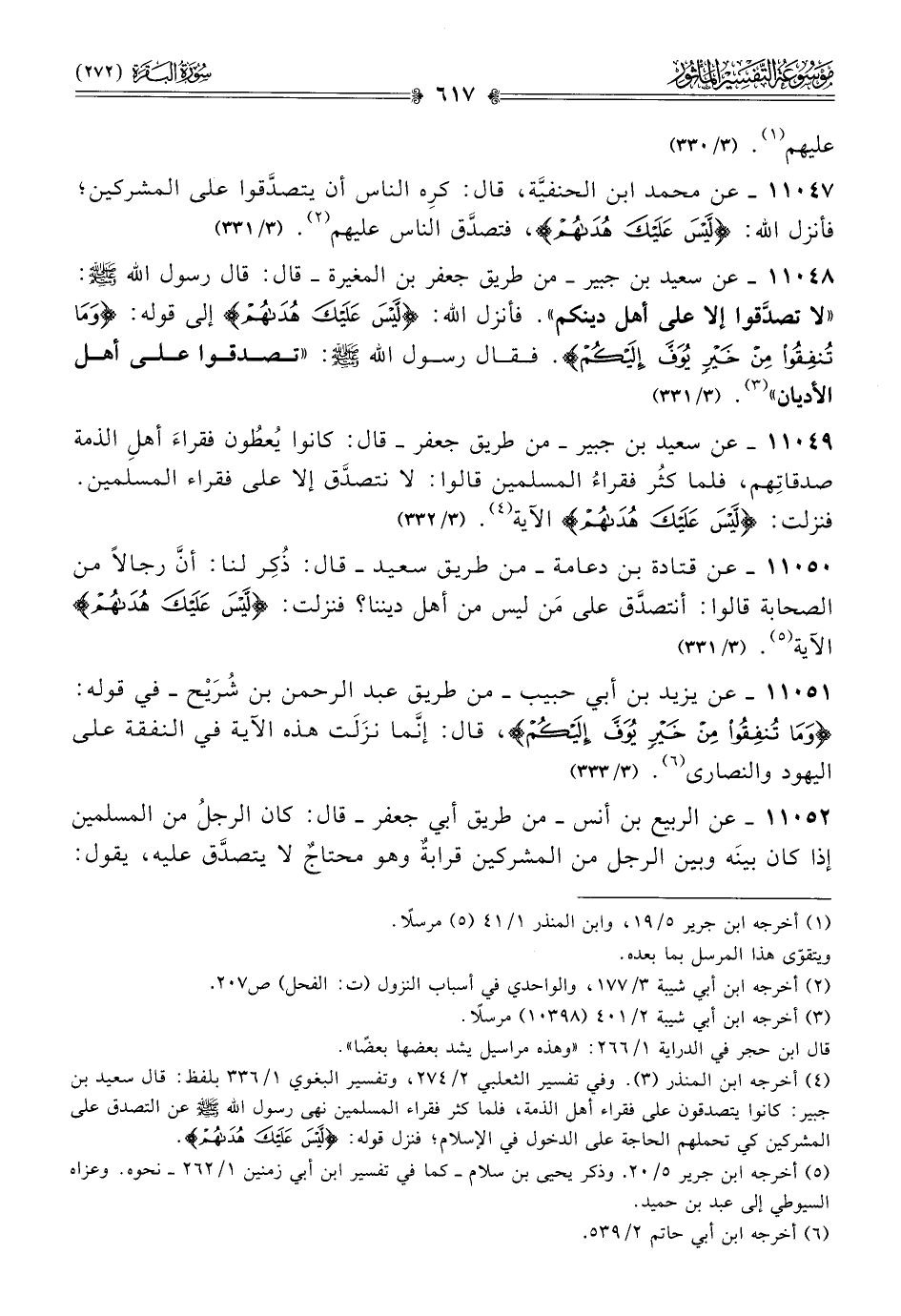 ١١٠٤٨ - عن سعيد بن جبير -من طريق جعفر بن المغيرة- قال: قال رسول الله - صلى الله عليه وسلم -: «لا تصدَّقوا إلا على أهل دينكم». فأنزل الله: {ليس عليك هداهم} إلى قوله: {وما تنفقوا من خير يوف إليكم}. فقال رسول الله - صلى الله عليه وسلم -: «تصدقوا على أهل الأديان» (¬٣). (٣/ ٣٣١)