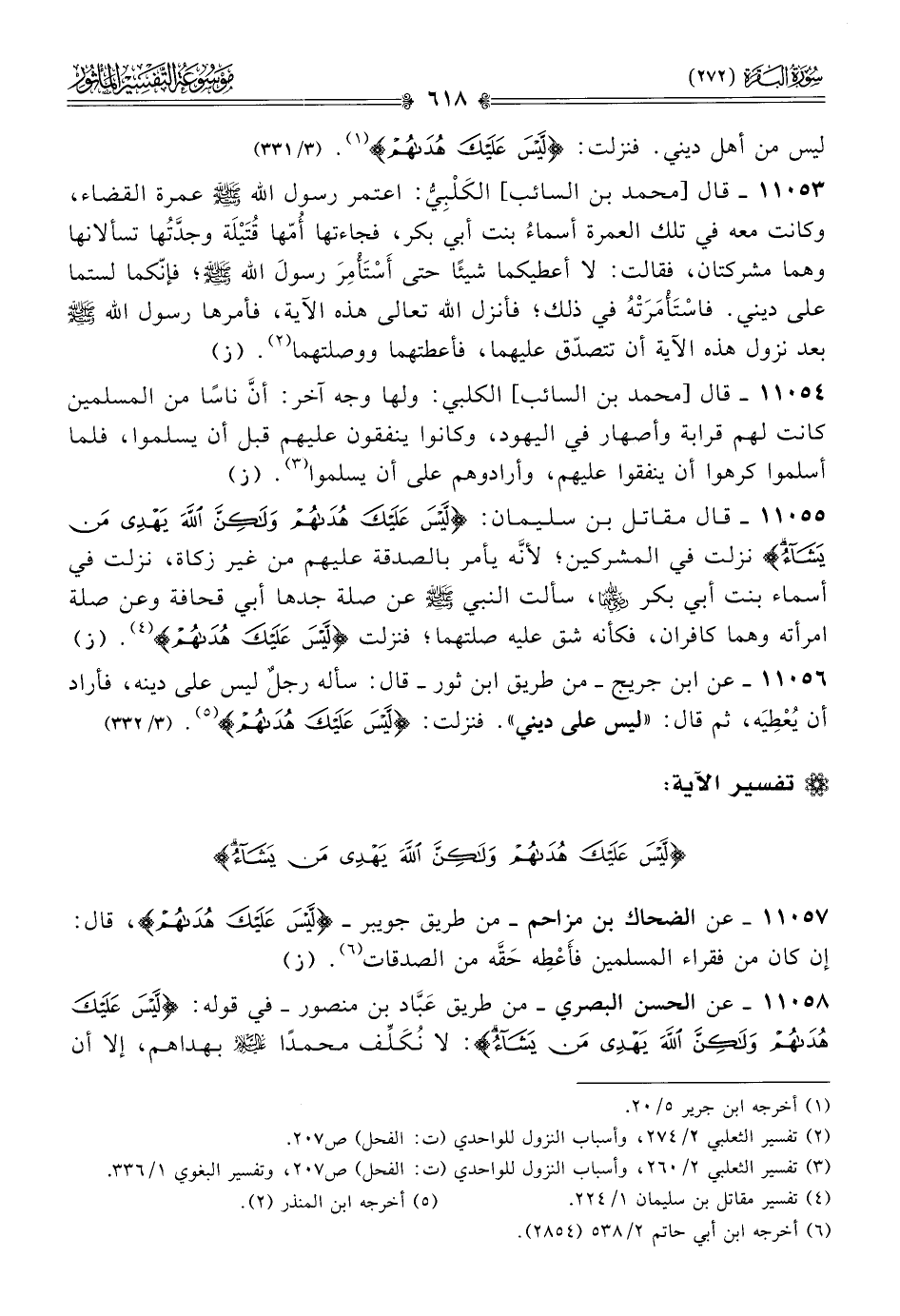 ١١٠٥٥ - قال مقاتل بن سليمان: {ليس عليك هداهم ولكن الله يهدي من يشاء} نزلت في المشركين؛ لأنّه يأمر بالصدقة عليهم من غير زكاة، نزلت في أسماء بنت أبي بكر - رضي الله عنهما -، سألت النبي - صلى الله عليه وسلم - عن صلة جدها أبي قحافة وعن صلة امرأته وهما كافران، فكأنه شق عليه صلتهما؛ فنزلت {ليس عليك هداهم} (¬٤). (ز)