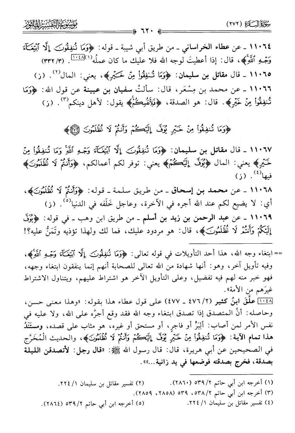 [١٠٤٨] علَّقَ ابنُ كثير (٢/ ٤٧٦ - ٤٧٧) على قول عطاء هذا بقوله: «وهذا معنى حسن، وحاصله: أنّ المتصدق إذا تصدق ابتغاء وجه الله فقد وقع أجرُه على الله، ولا عليه في نفس الأمر لمن أصاب: ألِبَرٍّ أو فاجرٍ، أو مستحق أو غيره، هو مثاب على قصده، ومستَنَدُ هذا تمام الآية: {وما تُنْفِقُوا مِن خَيْرٍ يُوَفَّ إلَيْكُمْ وأَنْتُمْ لا تُظْلَمُونَ}، والحديث المُخَرَّج في الصحيحين عن أبي هريرة، قال: قال رسول الله - صلى الله عليه وسلم -: «قال رجل: لأتصدقن الليلة بصدقة، فخرج بصدقته فوضعها في يد زانية ... »».