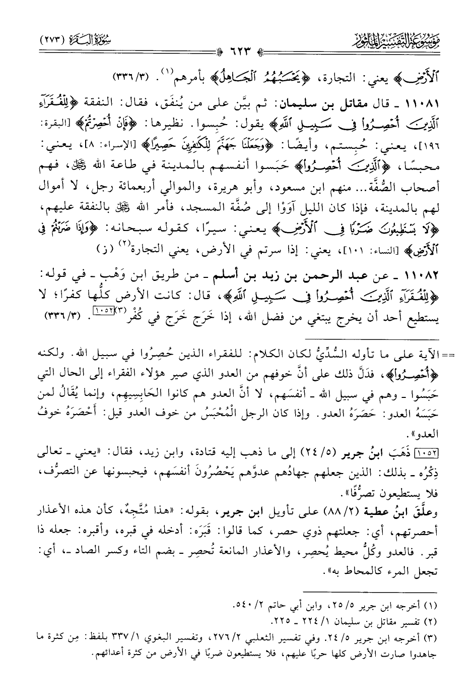 ١١٠٨٢ - عن عبد الرحمن بن زيد بن أسلم -من طريق ابن وهْب- في قوله: {للفقراء الذين أحصروا في سبيل الله}، قال: كانت الأرض كلُّها كفرًا؛ لا يستطيع أحد أن يخرج يبتغي من فضل الله، إذا خَرَج خَرَج في كُفْر (¬٣) [١٠٥٢]. (٣/ ٣٣٦)