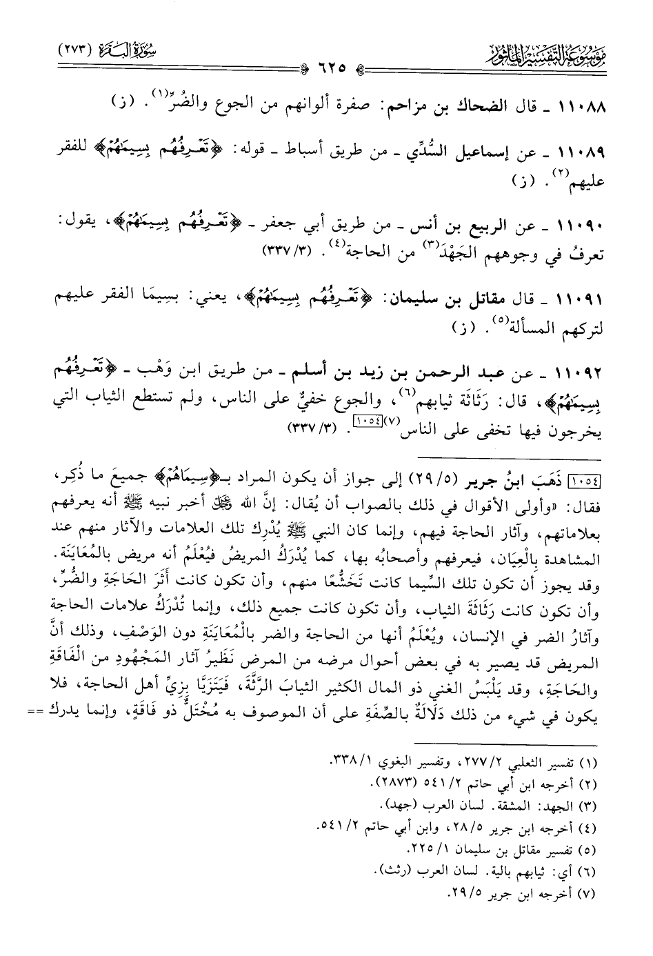 ١١٠٩٢ - عن عبد الرحمن بن زيد بن أسلم -من طريق ابن وهْب- {تعرفهم بسيماهم}، قال: رَثاثَة ثيابهم (¬٦)، والجوع خفيٌّ على الناس، ولم تستطع الثياب التي يخرجون فيها تخفى على الناس (¬٧) [١٠٥٤]. (٣/ ٣٣٧)