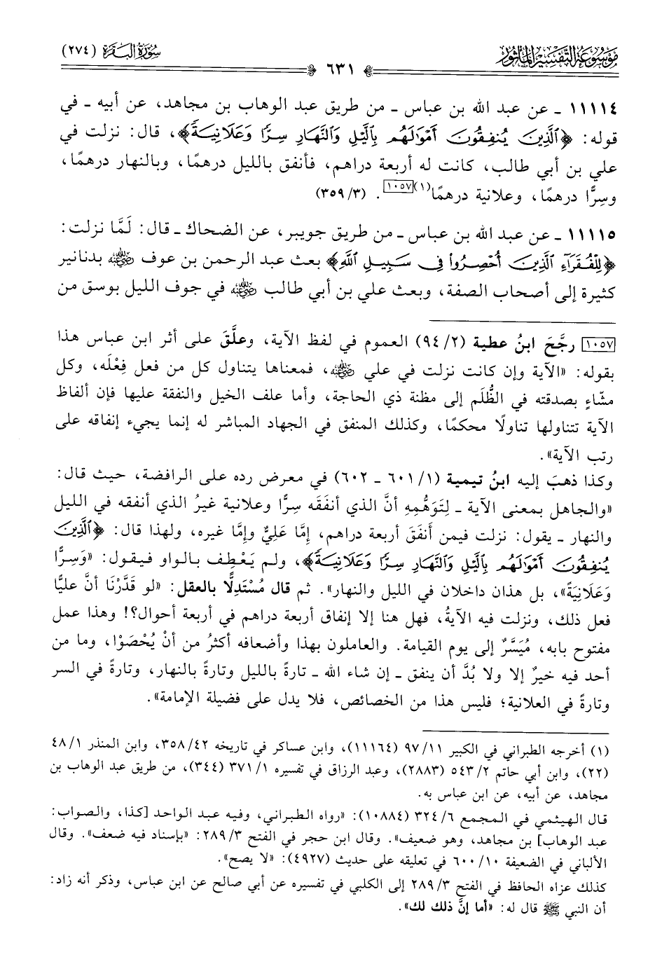 وكذا ذهبَ إليه ابنُ تيمية (١/ ٦٠١ - ٦٠٢) في معرض رده على الرافضة، حيث قال: «والجاهل بمعنى الآية -لِتَوَهُّمِهِ أنّ الذي أنفَقَه سِرًّا وعلانية غيرُ الذي أنفقه في الليل والنهار- يقول: نزلت فيمن أنفَقَ أربعة دراهم، إمّا عَلِيٌّ وإمّا غيره، ولهذا قال: {الَّذِينَ يُنْفِقُونَ أمْوالَهُمْ بِاللَّيْلِ والنَّهارِ سِرًّا وعَلانِيَةً}، ولم يَعْطِف بالواو فيقول:» وسِرًّا وعَلانِيَةً «، بل هذان داخلان في الليل والنهار». ثم قال مُسْتَدِلًّا بالعقل: «لو قَدَّرْنا أنّ عليًّا فعل ذلك، ونزلت فيه الآيةُ، فهل هنا إلا إنفاق أربعة دراهم في أربعة أحوال؟! وهذا عمل مفتوح بابه، مُيَسَّرٌ إلى يوم القيامة. والعاملون بهذا وأضعافه أكثرُ من أنْ يُحْصَوْا، وما من أحد فيه خيرٌ إلا ولا بُدَّ أن ينفق -إن شاء الله- تارةً بالليل وتارةً بالنهار، وتارةً في السر وتارةً في العلانية؛ فليس هذا من الخصائص، فلا يدل على فضيلة الإمامة».